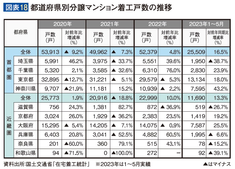 また直近2023年1~5月では、首都圏は前年同期比16.5%増の2万5,509戸、近畿圏も同13.3%増の1万1,690戸となっている。首都圏では東京都、神奈川県で持ち直しがうかがえる。埼玉県では前年の増加もあって低調。近畿圏では、大阪府、京都府は前年同期を上回る一方、外周地域では奈良県などで一服感もうかがえる(図表17・18)。