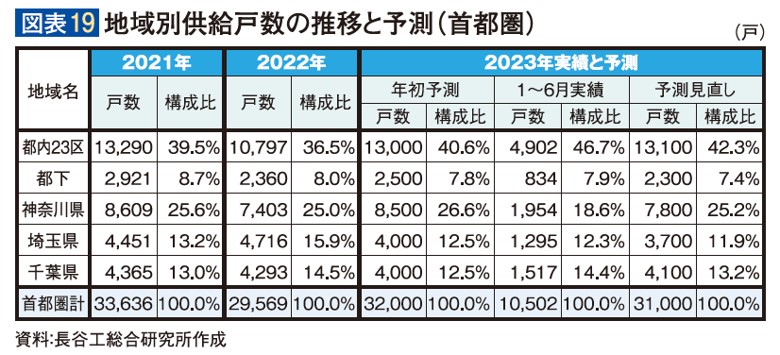 首都圏では2022年の着工戸数から4万戸を超える供給能力が潜在している。下半期は都内23区にとどまらず、近郊・郊外エリアでも大規模物件の第1期発売が多数予定されているのに加え、2021年着工の発売済み物件の未供給戸数が3,000戸台は存在していることから、下半期は前年同期(1万6,857戸)を上回る2万戸強、年間では3万1,000戸程度の供給が行われると予測した(図表19)。