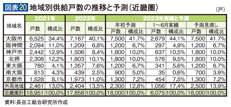 近畿圏においても2022年の着工戸数から約1万7,000戸の供給能力が潜在している。下半期は東大阪、阪神間などで大規模物件の供給が予定されているのに加え、2021年着工の発売済み物件の未供給戸数が2,000戸は存在していることから、下半期は前年同期(1万663戸)を上回る1万2,000戸程度と予測した。年間では年初予測通り1万8,000戸程度の供給が行われると見込む(図表20)。