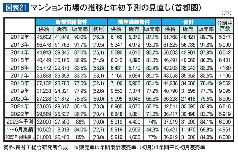 引き続き時間をかけてじっくり販売を行う傾向は継続すると考えられる一方、下半期は新規供給戸数の大幅な回復を見込む。しかしながら首都圏では上半期の落ち込みの影響により、年間の新規供給戸数については年初予測の見直しを行う。