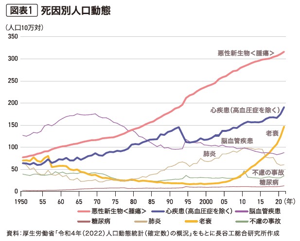 死因別の人口動態をみると、「悪性新生物<腫瘍>(がん)」による死亡者がこの70年間で一貫して増えているほか、近年は「老衰」死も急激に増加している(図表1)。