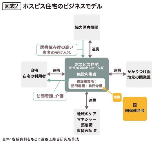 大半のホスピス住宅は、住宅型有料老人ホームかサ高住の種別で開設され、「サービス外付け型」の事業として運営が行われる。訪問看護事業所や訪問介護事業所が建物に併設されていることが多く、これらの事業所からサービスが提供される形態をとる(図表2)。