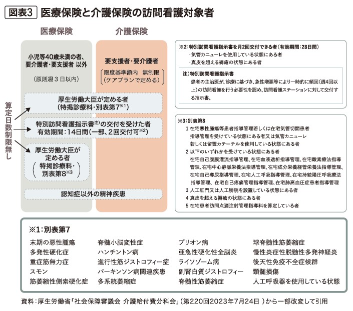 医療保険適用の訪問看護を受けられるのは、小児等40歳未満の者、要介護・要支援の認定を受けていない者で、原則週3日以内の訪問看護の提供を受けることができる。一方、介護保険適用の訪問看護を受けられるのは、要支援・要介護の認定を受けた者で、ケアマネジャー(介護支援相談員)が作成するケアプラン(介護サービス計画書)で定めるサービス提供の限度基準額内であれば、訪問日数に制限はない(図表3)。