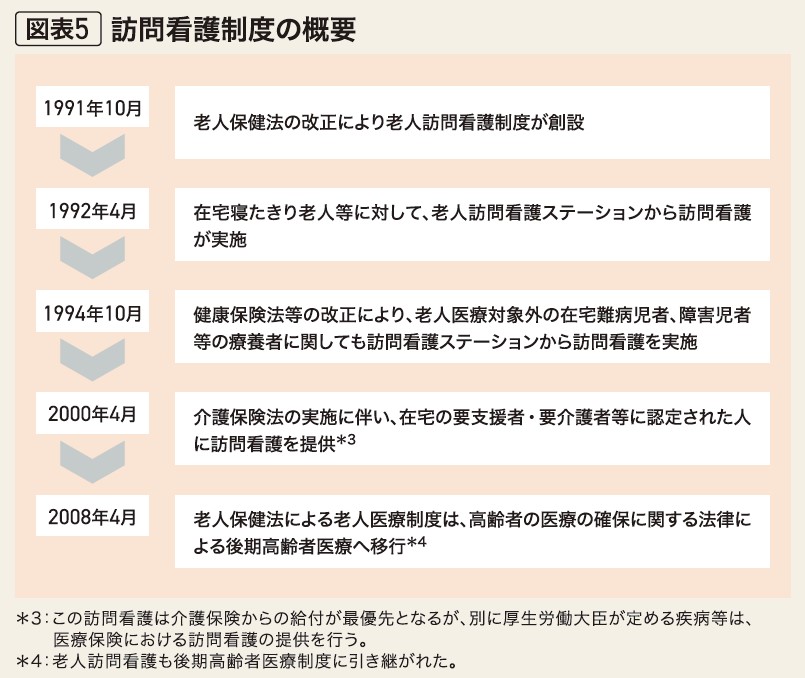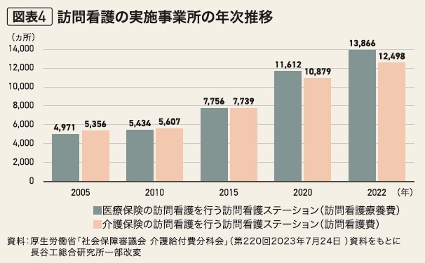 訪問看護事業所(訪問看護ステーション)の数は、2005年から2022年までの17年間で、医療保険適用のステーションが約2.8倍、介護保険適用のステーションが約2.3倍と増加している(図表4)。
