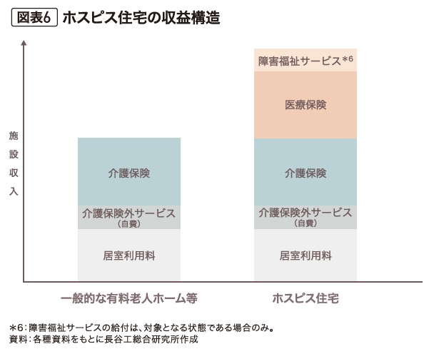 ホスピス住宅は、「居室利用料(家賃)」と「介護保険収入」に加えて、医療依存度の高い入居者に提供する訪問看護サービスによる「医療保険収入」等を加えた収入構造となっているのが特徴で、これまでの一般的な老人ホーム等とは大きな差があります(図表6)。