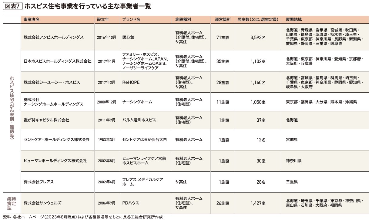 一般的な有料老人ホームやサ高住を運営する事業者に比べれば、ホスピス住宅を運営する事業者は圧倒的に少ないものの、“ブルーオーシャン”市場という現状から、先発組はホスピス住宅の運営に特化し、短期間で急速に事業拡大している。また、創業者が元医師や元看護師といった経歴である場合もあり、医療・看護業界で培った知見や専門的な技量、人的ネットワークも活かしながら事業拡大を図っている。
