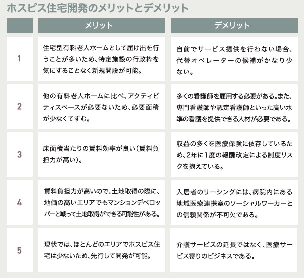 がん末期等の患者が終末期ケアを受ける場としての病院の緩和ケア病棟では、診療報酬等の関係から平均入院期間が30日以内との統計もあり、こうした緩和ケア病棟退院患者の受け皿として、また一般的な老人ホームでは受け入れが困難な医療依存度の高い高齢者の受け皿として、ホスピス住宅の存在感は高まっています。