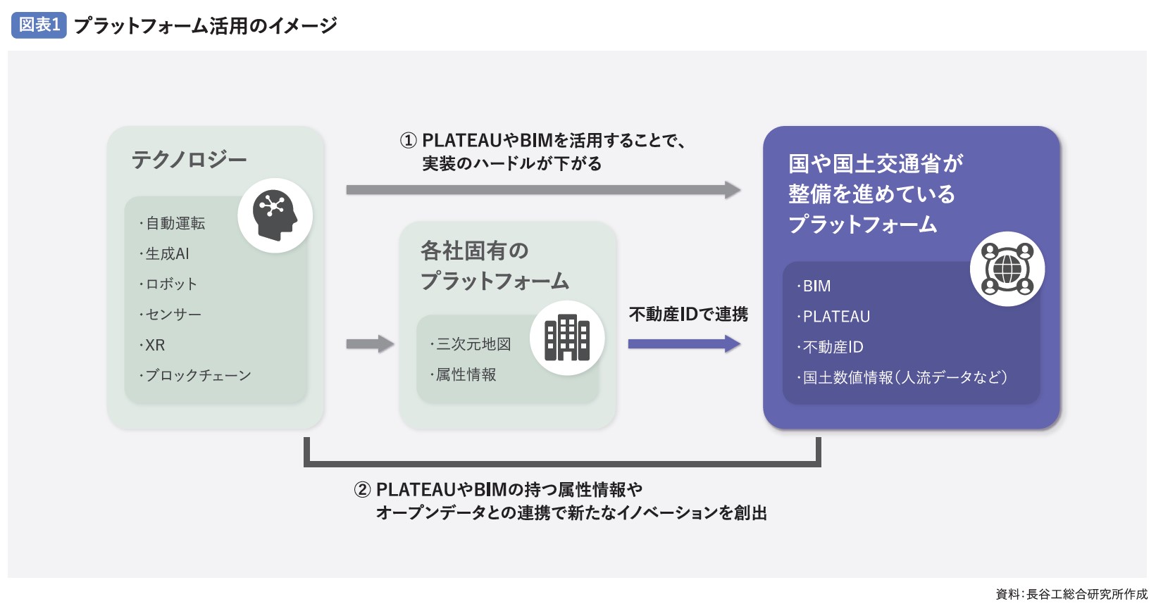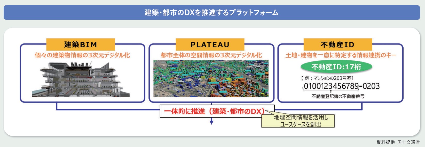 デジタル化を推進する上で、デジタルデータのメリットを活かすと共に、将来に向けて拡張性を確保するためには、内外の様々なデータと連携が容易な構造が求められる。そのため共通の基盤となるプラットフォームが必要となる。建築・都市のDXで必要とされる地理空間情報については国土交通省により「BIM」「PLATEAU」「不動産ID」の整備が進められている。建築物の形状、材質、施工方法といったデータは「建築BIM」、都市空間における建築物や道路の配置に関わるデータは「PLATEAU」が対応することで、建物内からエリア・都市スケールまでシームレスに再現した高精細な三次元の空間データとなる。これに土地・建物の位置を特定する「不動産ID」を組み合わせ、各種のオープンデータや各社の持つ内部データと連携させることでフィジカル空間を反映させたサイバー空間、デジタルツインの構築が可能となる。また、一体として活用する以外に、企業や自治体独自のシステムに必要としている要素をそれぞれのプラットフォームから取り込むことで高度化を図れることも期待できる。