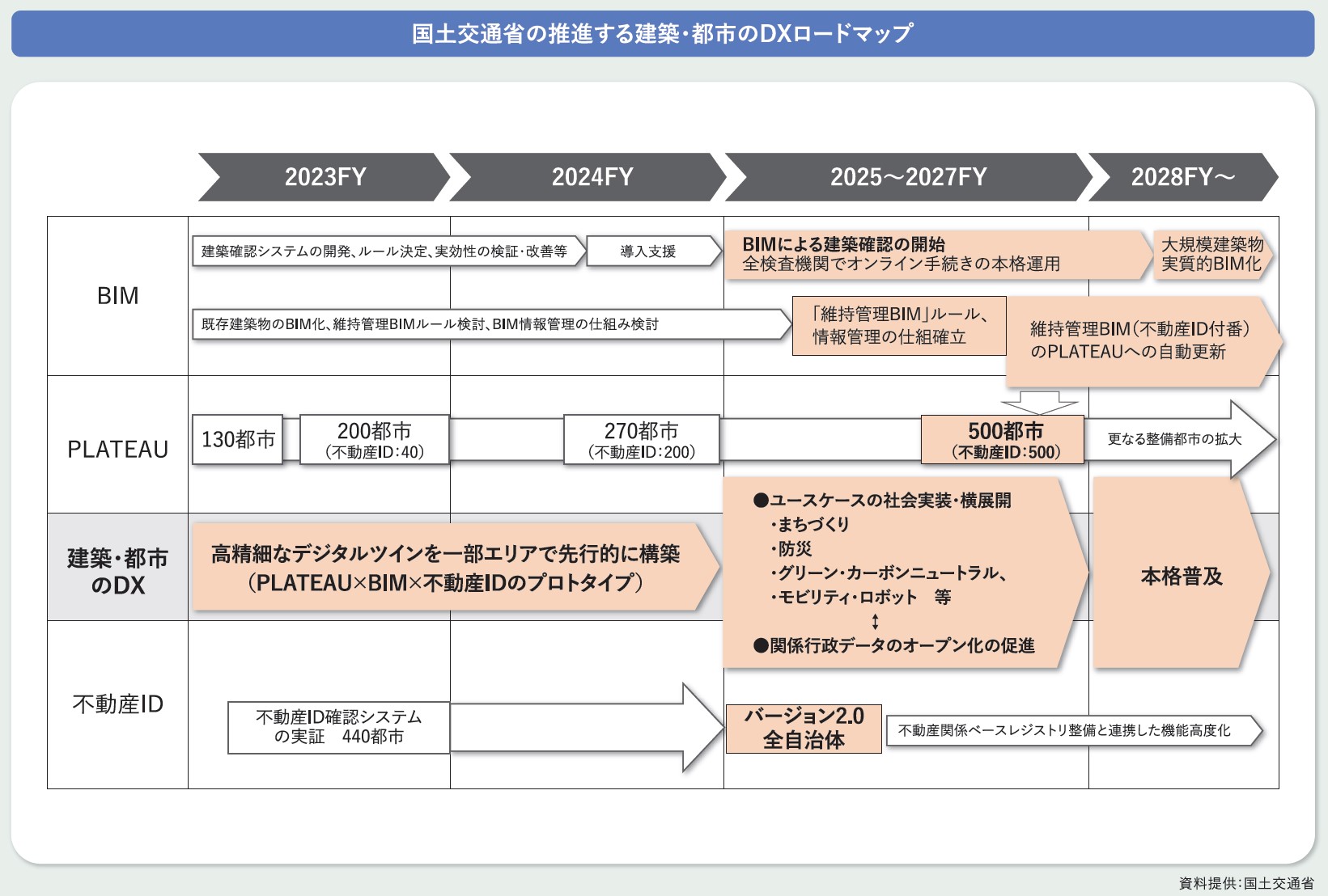 直近の政府の方針でも6月に閣議決定した「新しい資本主義の加速」として建築・都市のDXへの取り組みを明記し、その実行計画の中で建築物の形状、材質、施工方法に関する3次元データ「BIM」、都市空間における建築物や道路の配置に関する3次元モデル「PLATEAU」、土地や建物に関する固有の識別番号「不動産ID」の活用を重点的に進めると定めています。この「BIM」「PLATEAU」「不動産ID」は地理空間情報を活用していく上で基盤となるプラットフォームであり、一体として整備を進めています。その現在位置と将来目標についてはロードマップを作成しており、2025年にユースケースを横展開し、2028年の本格普及を目指して整備と推進を進めています。