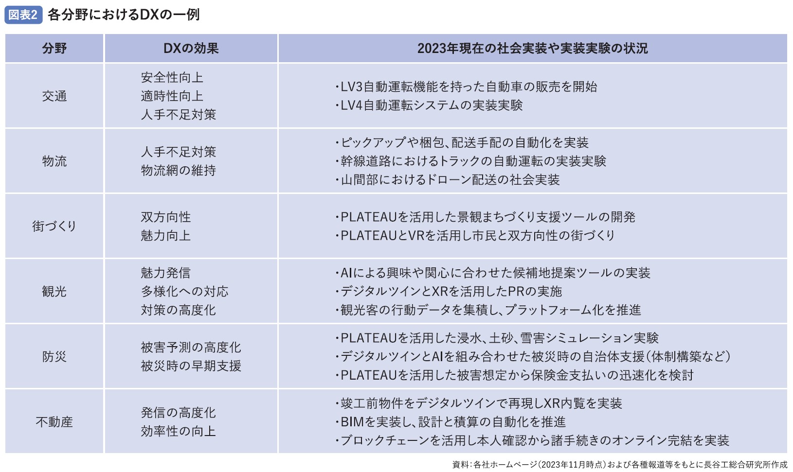 その他、防災分野では災害シミュレーションにデジタルツインを活用することによる被害予測の高度化、不動産分野でも開発から販売までデジタル技術による効率化が図られるなど幅広い領域でデジタル技術を活用したDXが進展している(図表2)。現在、様々な取り組みが始まり、広がりの可能性を模索しながら推進を図る段階ではあるが、建築・都市DXの基盤となるプラットフォーム群の整備が進むと横展開や深化が進み、それぞれが連鎖することで大きな変化を生み出す可能性がある。