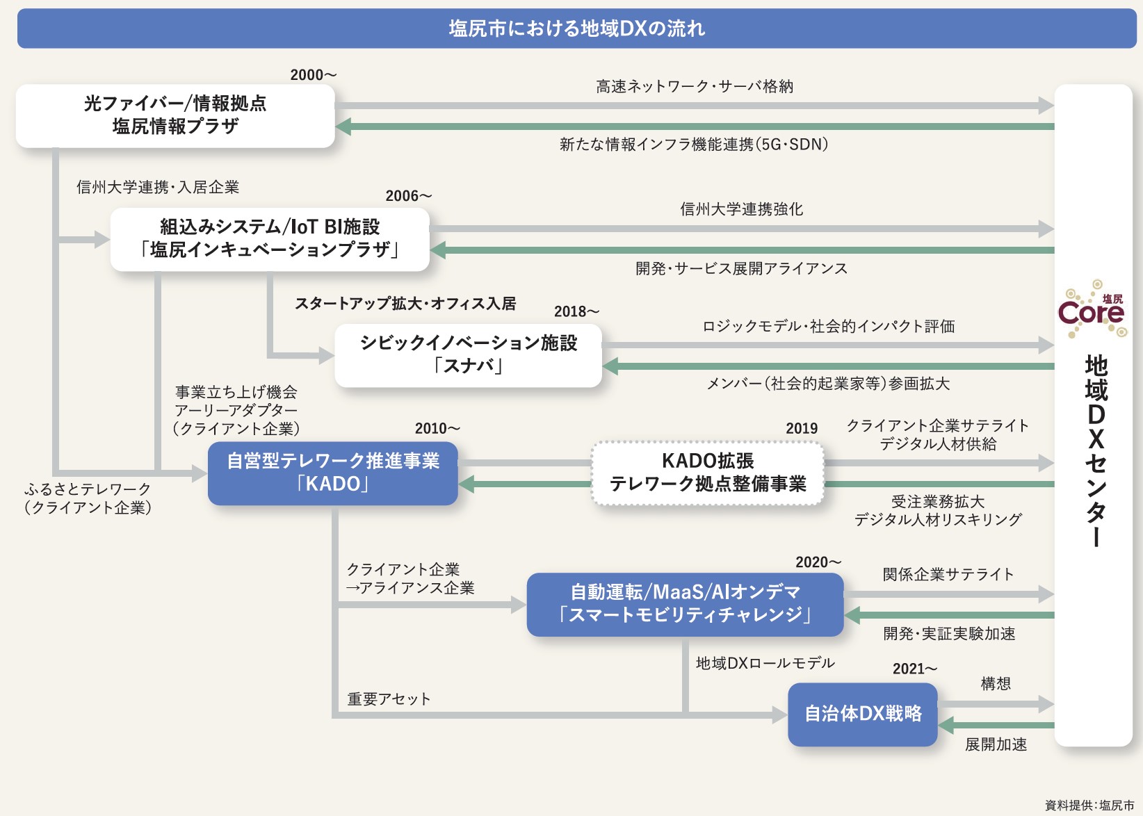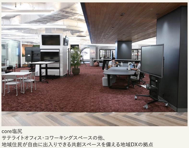 現在、塩尻市ではこの自動運転をはじめとするMaaSや「KADO」の取り組みにより培ったネットワークや共創のノウハウを生かし革新的な都市機能を創出する地域DX拠点として「core塩尻」を整備、塩尻市振興公社により運営されている。共創に携わる企業のサテライトオフィス、産官学民の交流も可能なコワーキングスペースを備えると共に、地域住民が自由に入れる共創スペースを設けている。産官学民交流によるシナジー効果を狙っている。
