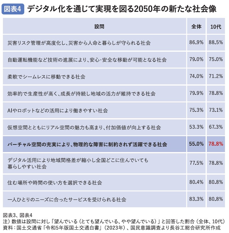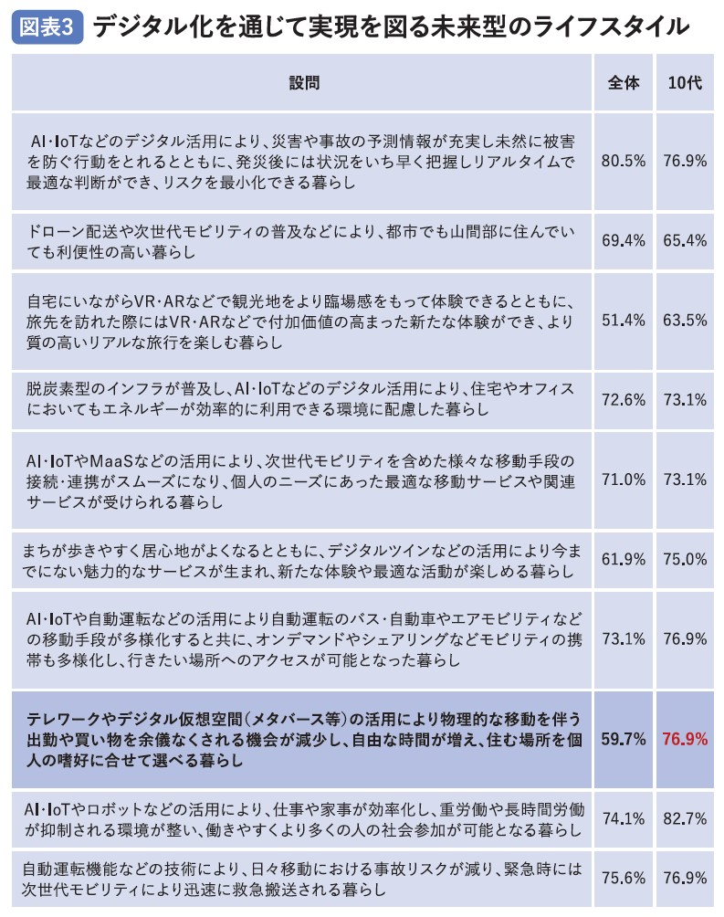 様々な分野でデジタル技術の活用が進んだ先に、どのような社会が望まれているのか。「令和5年版国土交通白書」(2023年)の中で、国民意識調査としてデジタル化を通じて実現を図る未来型のライフスタイルについてアンケートを行っている。それによると、回答全体では安心・安全、環境配慮、仕事の効率化に対する項目に高い関心がある。一方、10代の回答をみると、「テレワークやデジタル仮想空間(メタバース等)の活用により物理的な移動を伴う出勤や買い物を余儀なくされる機会が減少し、自由な時間が増え、住む場所を個人の嗜好に合わせて選べる暮らし」が全体の回答59.75に対し76.9%と17.2ポイント高かった(図表3)。