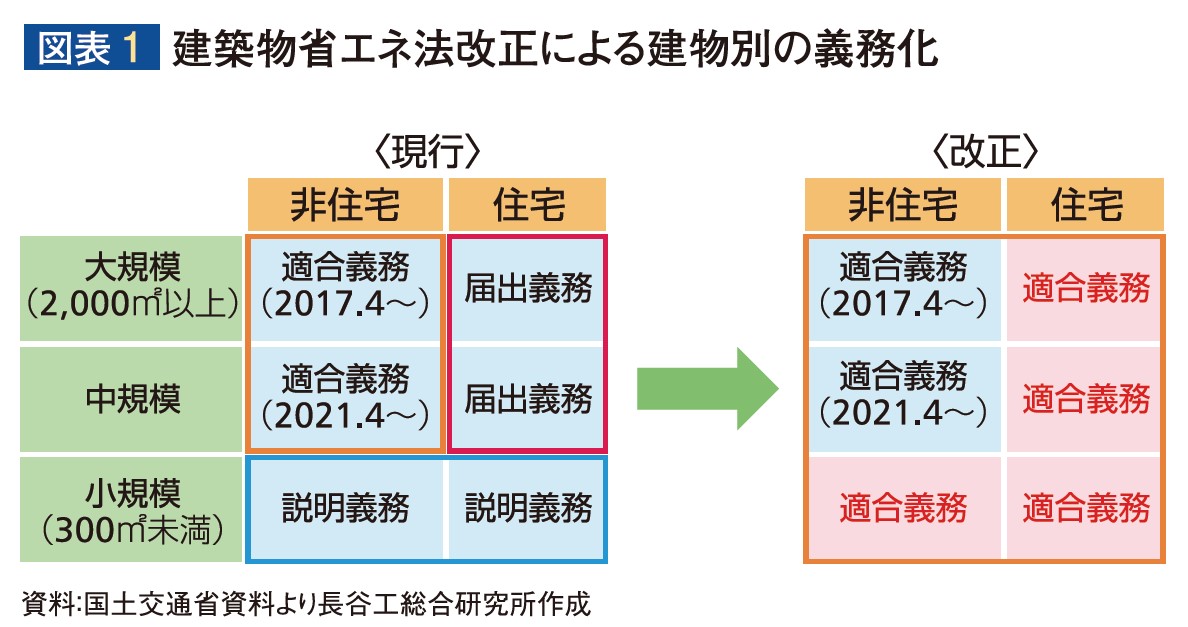 適合が義務付けられた(図表1)。これは2017年度以降住宅を除く建築用途に対する基準適合義務の適用範囲を徐々に拡大し、