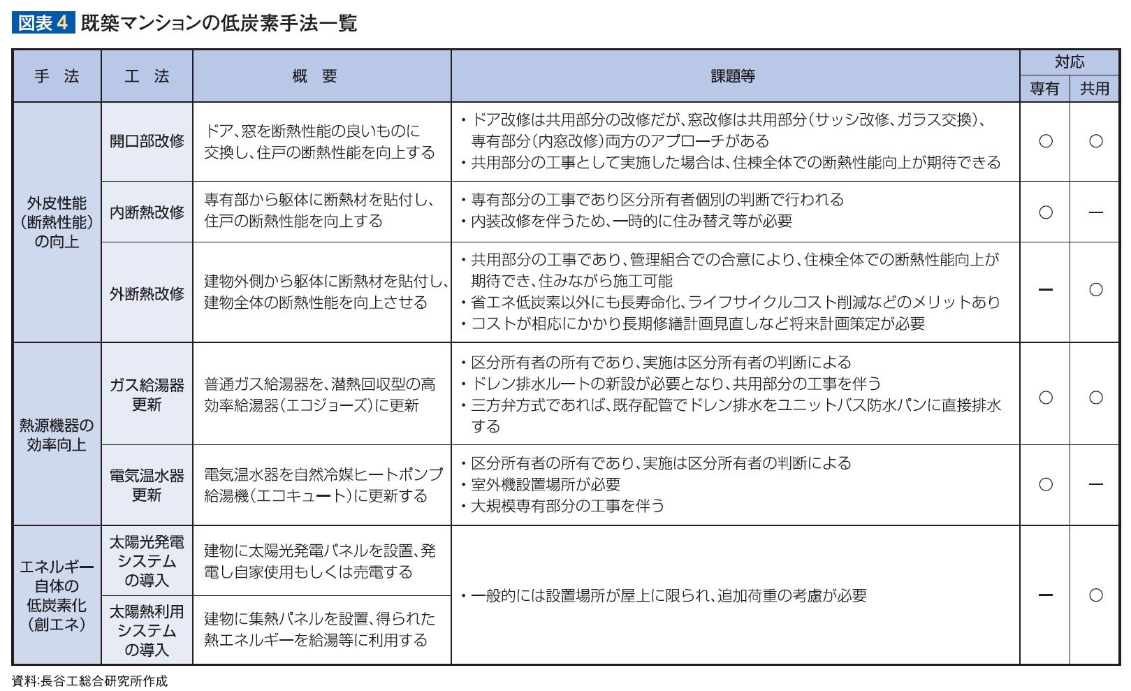 図表4に示したとおり、既築マンションの低炭素化手法には共用部分、専有部分それぞれのアプローチがある。たとえば、躯体の