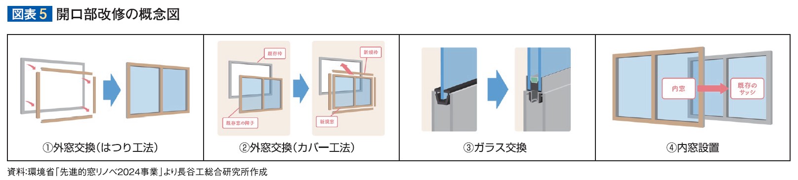 (カバー工法)、③ガラス交換、④内窓設置の4通りの工法がある(図表5)。