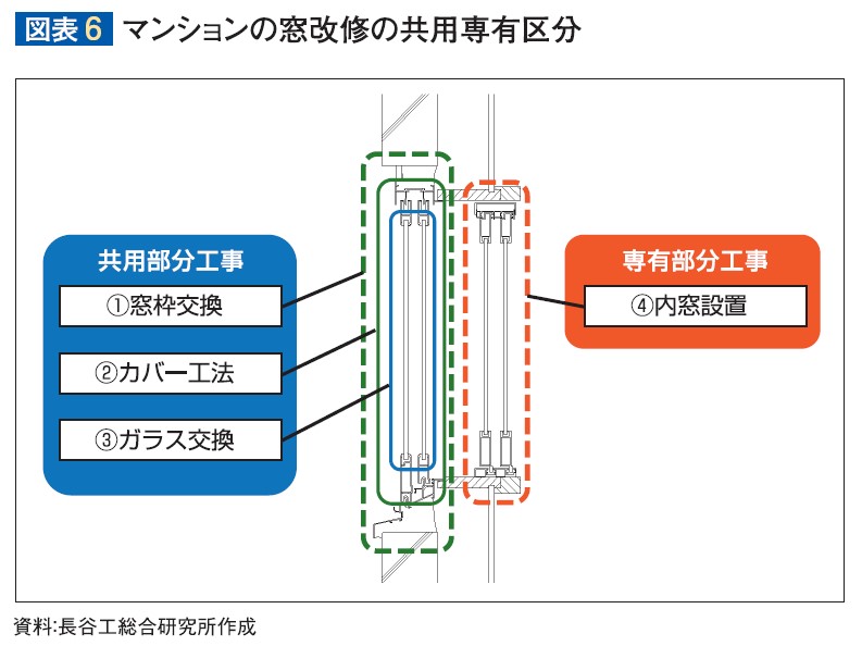 これらを専有、共用という区分で考えてみると、窓枠交換、カバー工法、ガラス交換は窓、ガラス、躯体を改修するため共用部分の