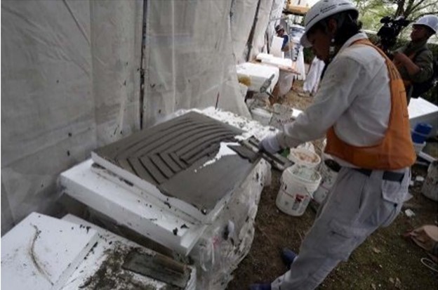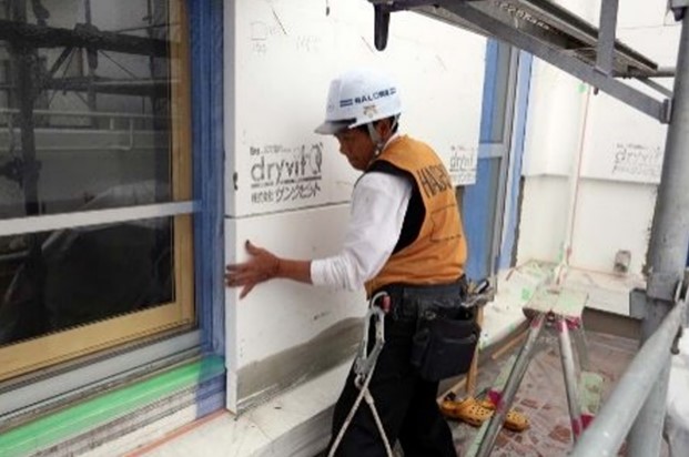 一般的な湿式工法では、断熱材を直接躯体に貼付し、上からメッシュシートと左官材料で仕上げる。躯体の外側に断熱材を置くため