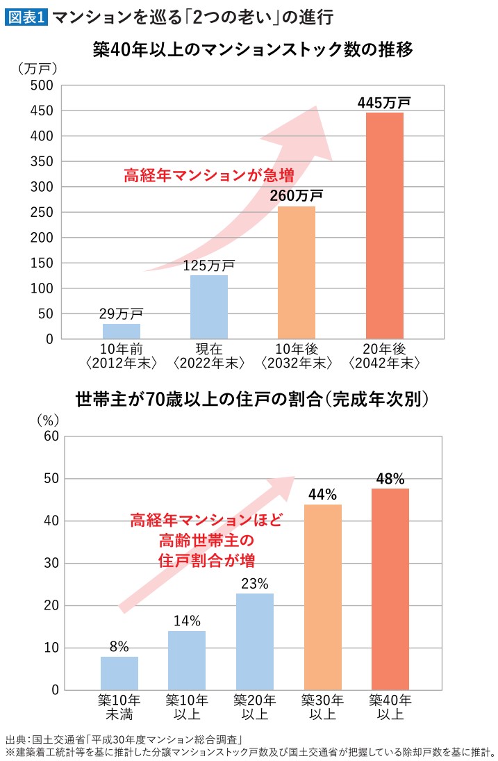 一方で、このうち築40年以上のマンションが約125万戸となっており、20年後には3.5倍の約445万戸まで増加していくことが