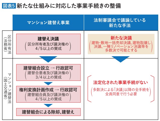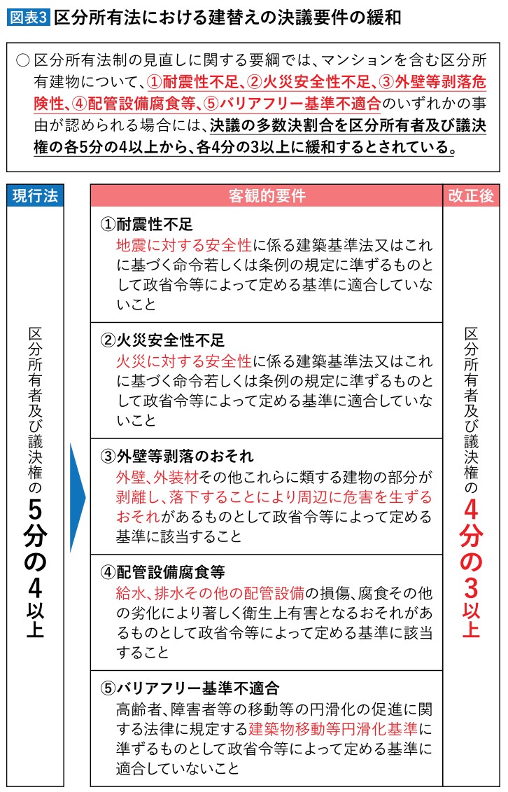 ついて、現行の建替え決議と同様五分の四の多数決で実施できる仕組みが提案されています。