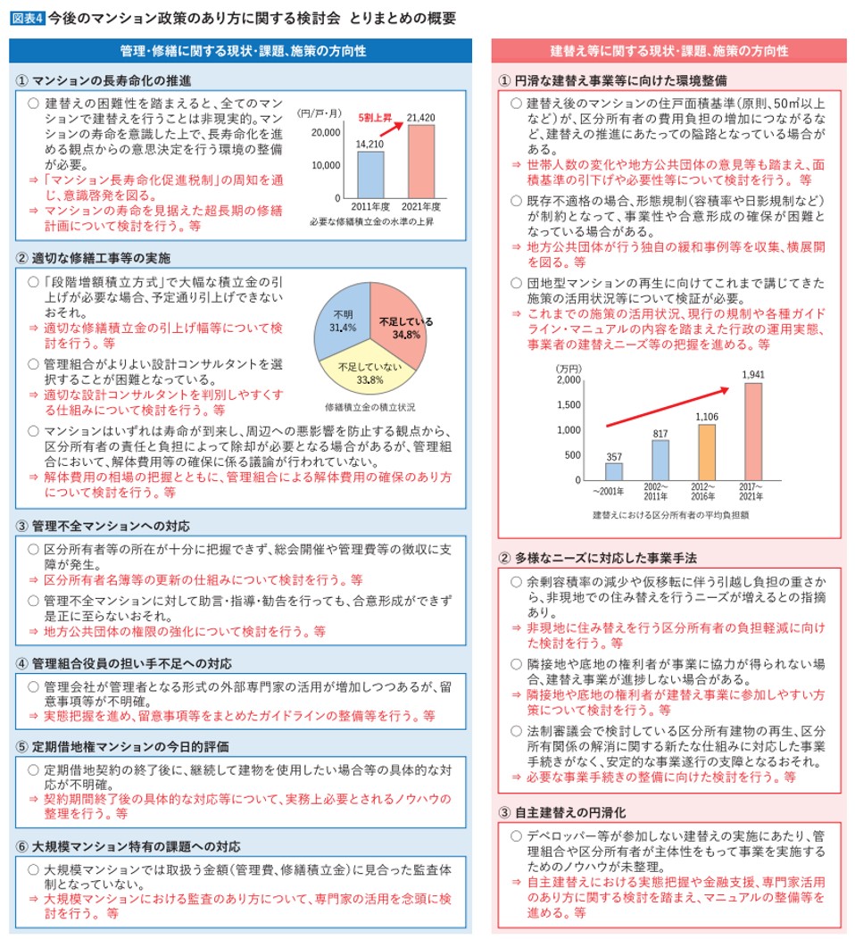ところです。一方、検討会においては、特に修繕積立金の安定的な確保やマンションの防災対策の推進に関する観点から、今後の