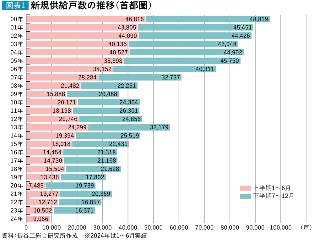 上半期に新規供給戸数が1万戸を下回るのは、新型コロナウイルスの感染が拡大した2020年以来。1回当たりの供給戸数が
