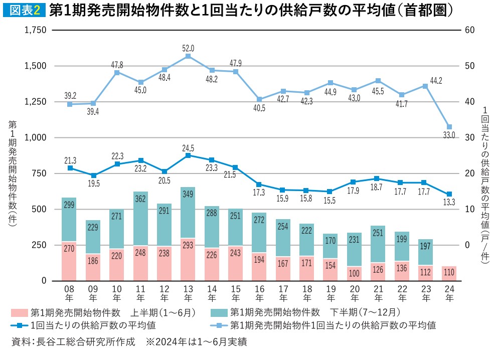 第1期発売開始物件は110件3,625戸、1回当たりの供給戸数は33.0戸で前年同期(112件4,709戸、1回当たりの供給戸数