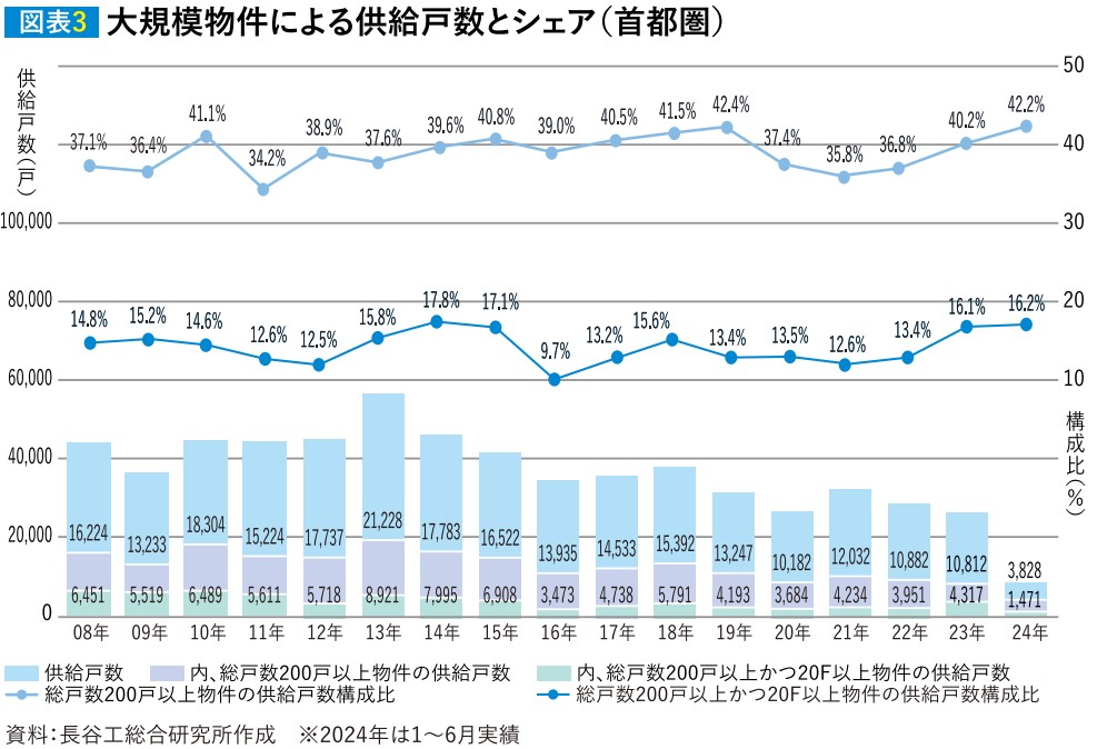 一方、以前より供給が続いている物件もあり、総戸数200戸以上の大規模物件の新規供給戸数は3,828戸、全体に占める構成比は