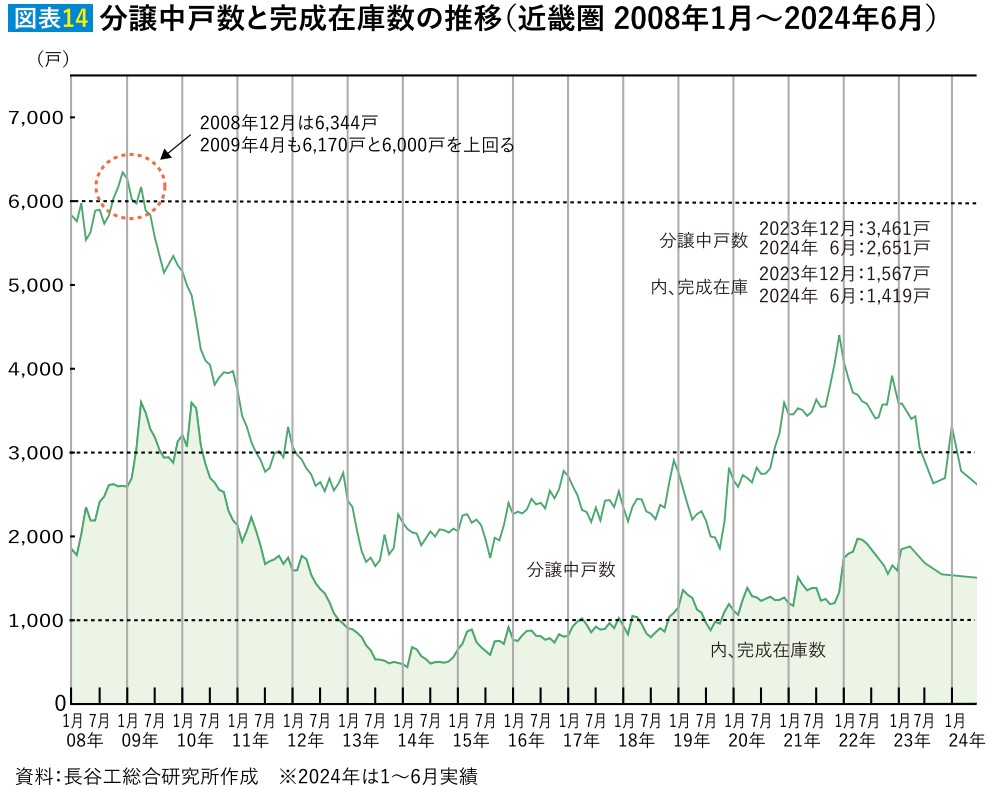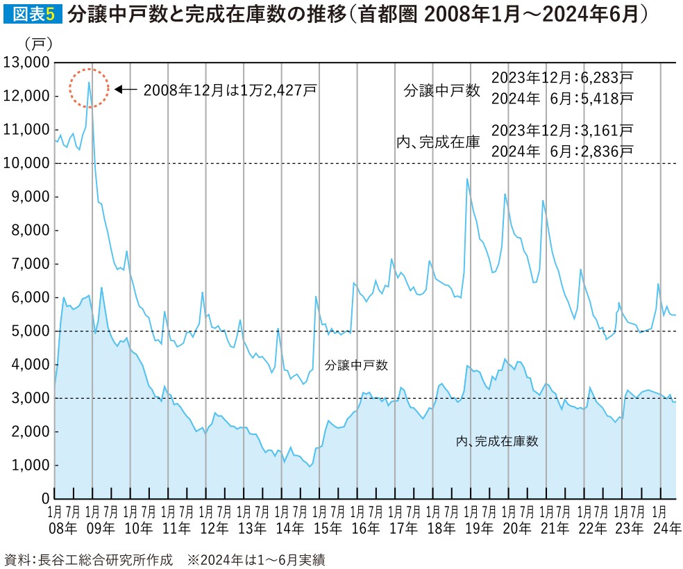 上回ったがその後、減少。2024年は5,000戸台で漸減しながら推移している。うち完成在庫は2,836戸。前年同月(2,930戸)から