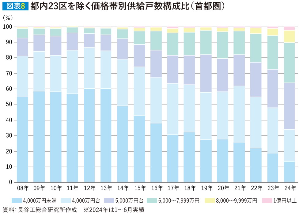 都内23区を除く地域の新規供給戸数を価格帯別に分類すると、2024年上半期は6,000万円以上の構成比が高まっているものの、