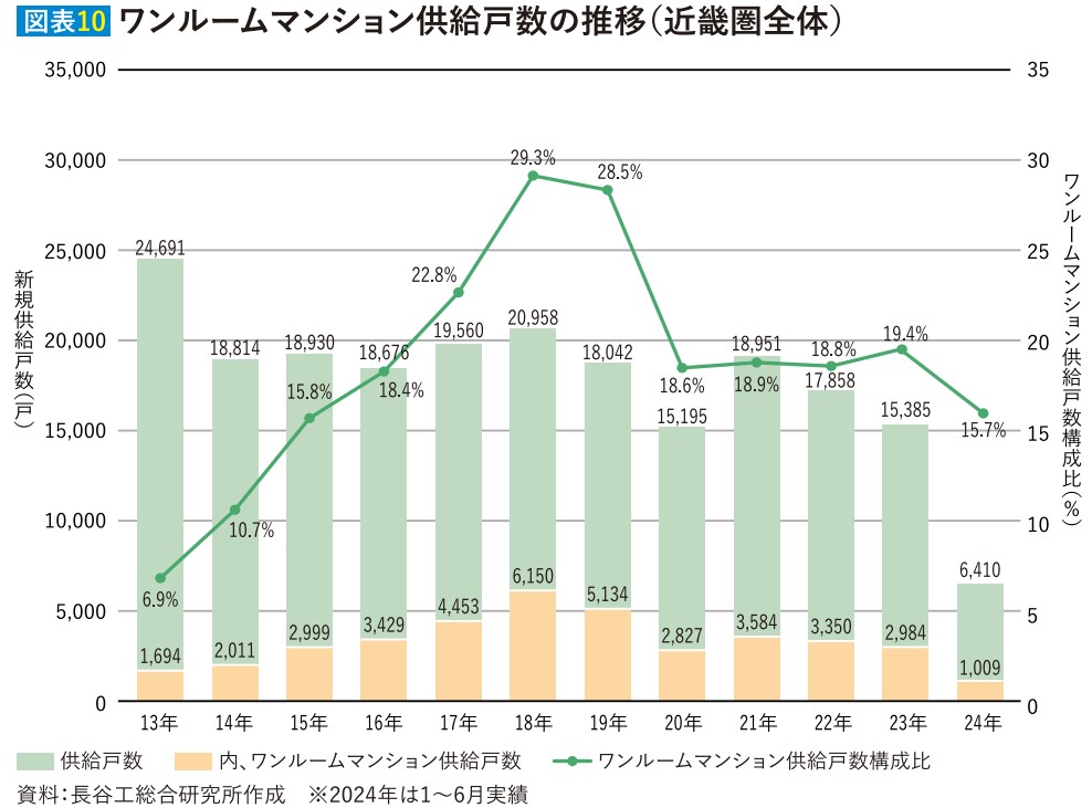 うちワンルームマンションは14件1,009戸で前年同期(12件1,036戸)を下回り、全体に占める構成比は15.7%で2020年からの