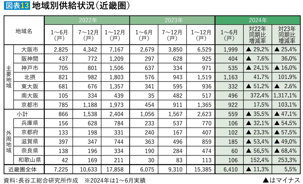 地域別供給状況をみると、大阪市、神戸市では前年同期に引き続き低調な供給が続くものの、大阪府下の北摂・南大阪、