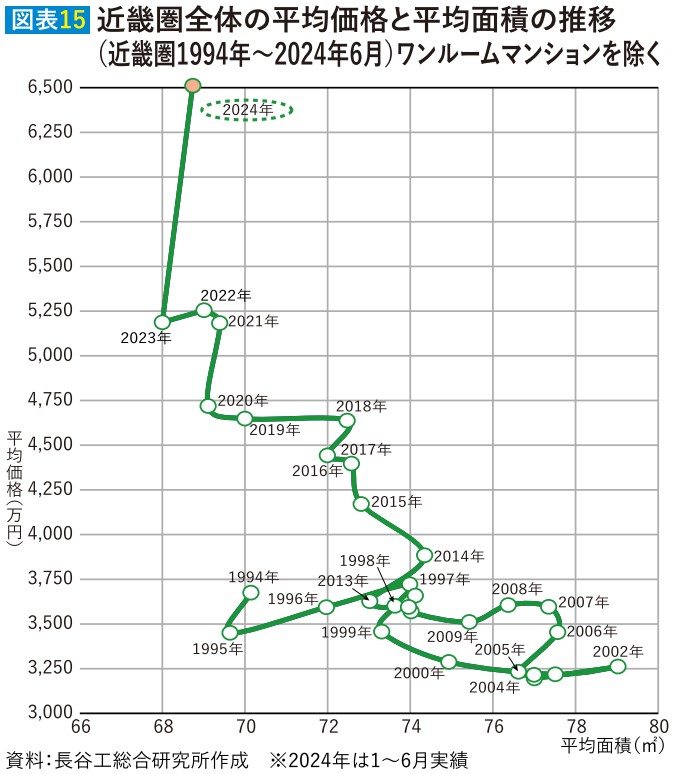近畿圏全体の供給商品内容をみると、分譲単価942千円/㎡(前年比19.2%アップ)、平均面積61.69㎡(同4.5%アップ)、