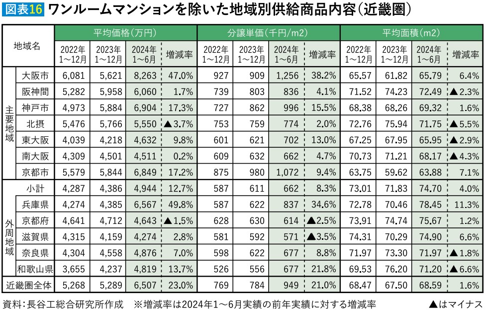ワンルームマンションを除いた地域別供給商品内容をみると、大阪市では都心部における再開発地域内における大規模物件の