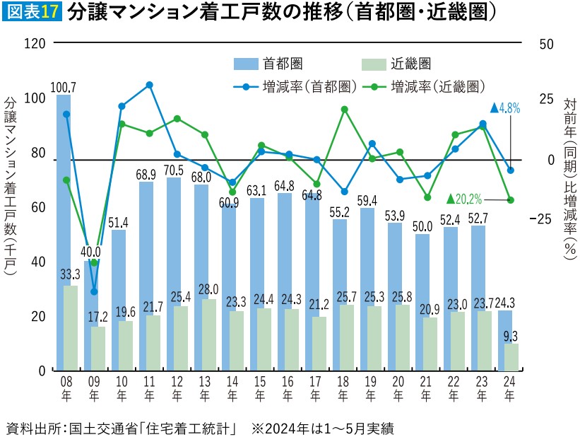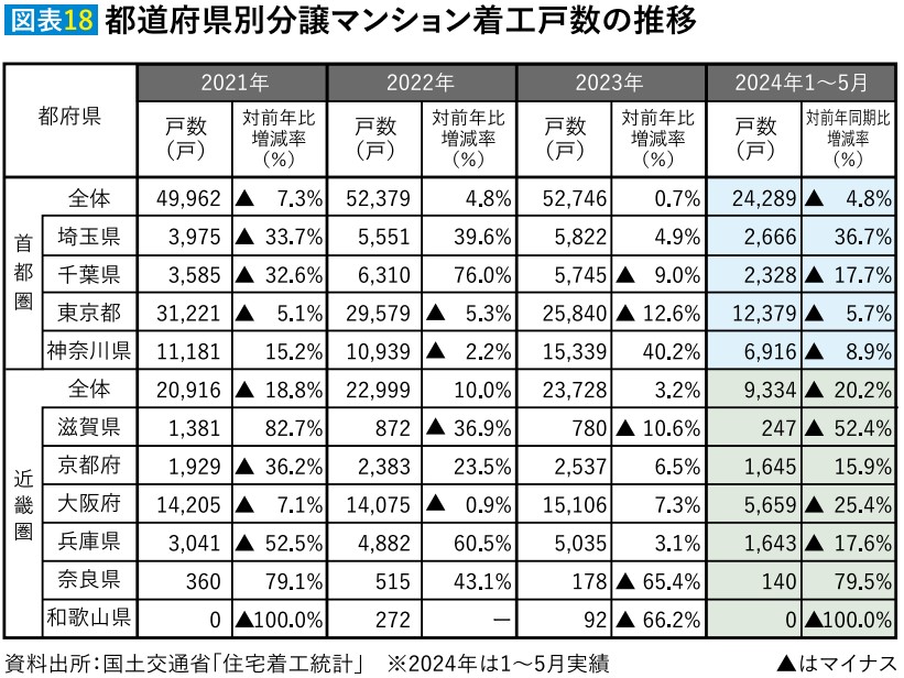 しかしながら直近2024年1~5月では、首都圏は前年同期比4.8%減の2万4,289戸、近畿圏も同比20.2%減の9,334戸と下回って