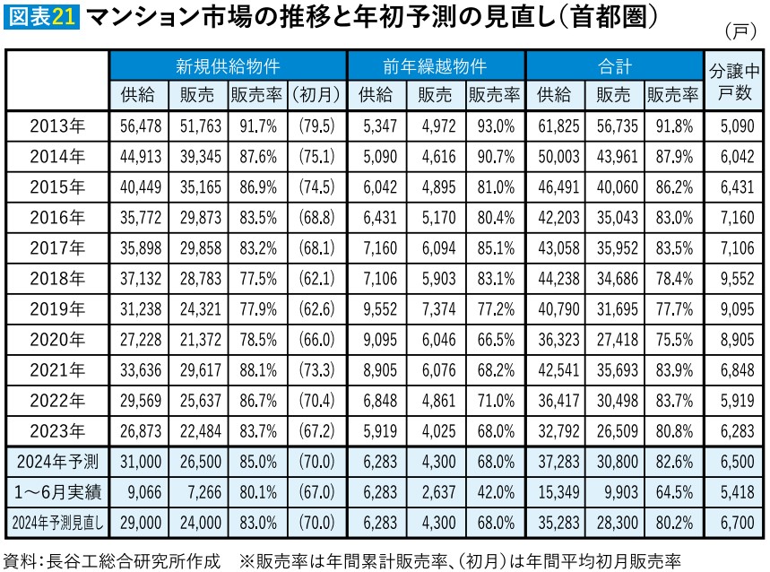 2021年以降、首都圏の上半期における初月販売率は70%以上で推移していたが、2024年は67.0%。前年同期(72.7%)より