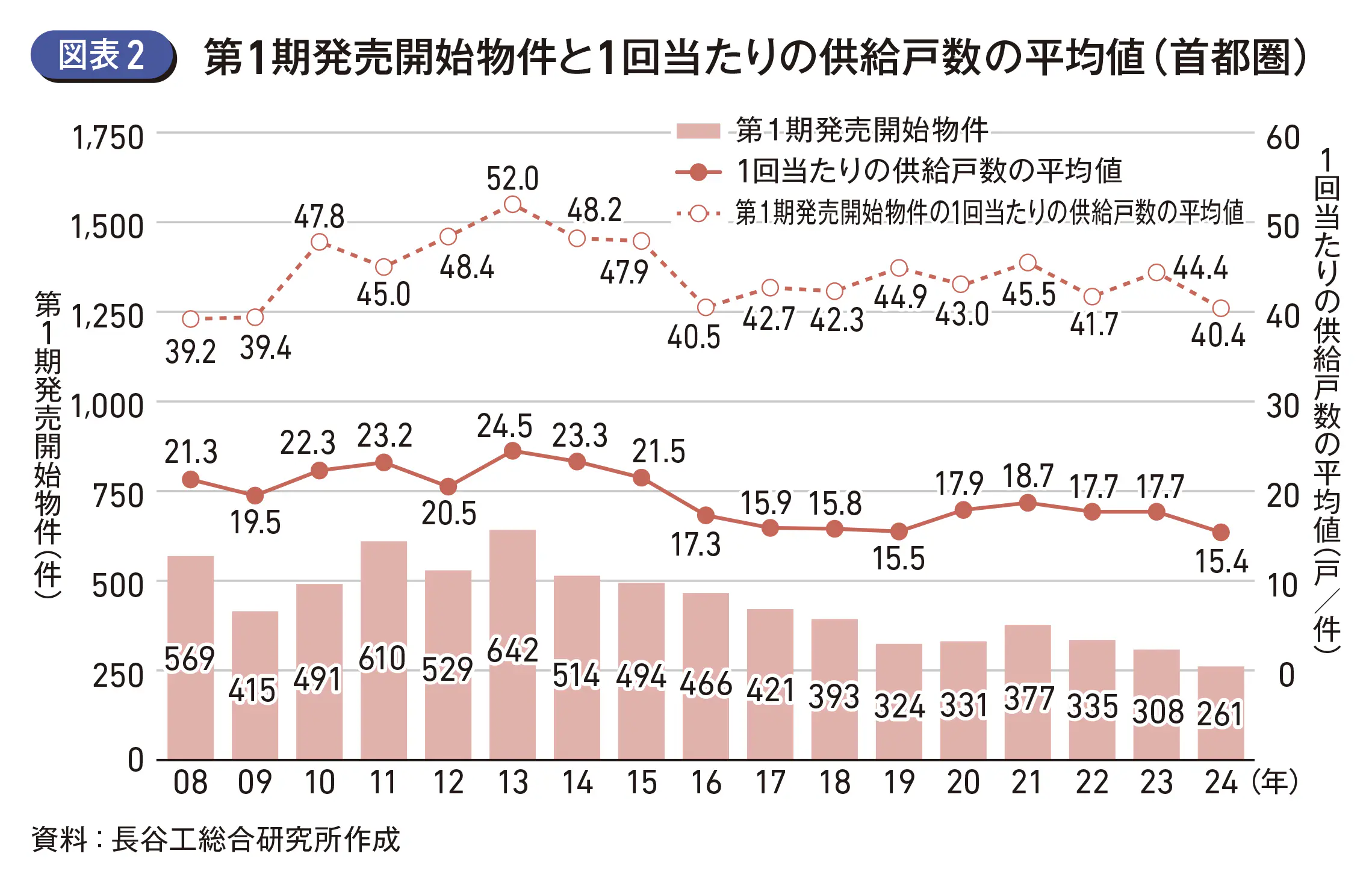 新規供給戸数は1,493件2万3,003戸で前年比14.4%減。年初予測では3万1,000戸、中間見直しでは2万9,000戸程度としたが、下半期も供給戸数は積みあがらず、予測に届かなかった(図表1)。供給件数は1,493件、供給プロジェクト数は486物件といずれも前年(供給件数1,515件、供給プロジェクト518物件)より絞り込まれた。また1回当たりの供給戸数が10戸未満にとどまる小分け供給物件は、構成比61.8%を占める。前年(54.3%)を上回っており、1回当たりの供給戸数の平均値は15.4戸/件で前年(17.7戸/件)から減少している。第1期発売開始物件も261件1万536戸で前年(308件1万3,661戸)を下回り、第1期発売開始物件の1回当たりの供給戸数の平均値も40.4戸/件と近時でみても低い水準となった(図表2)。