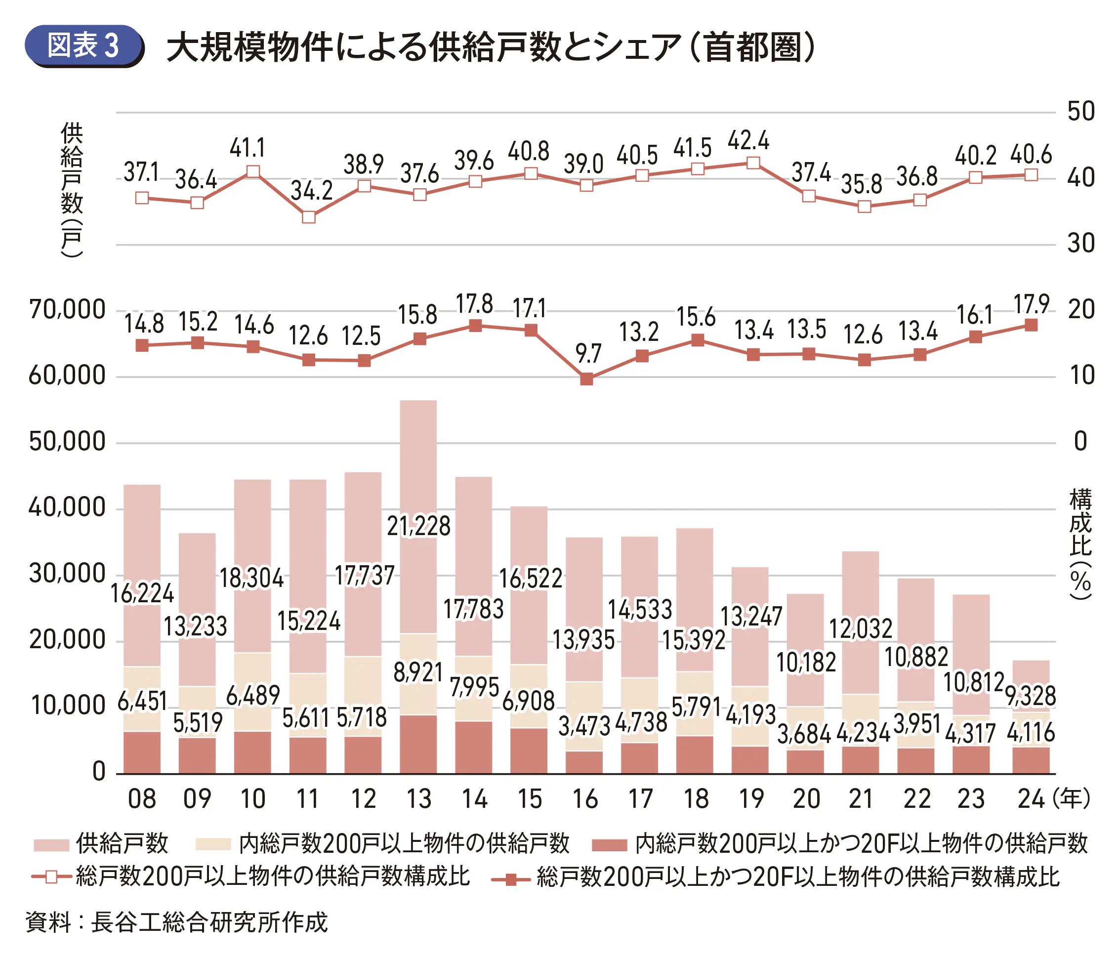 首都圏では所有権マンションに対する規模は小さく影響は限定的だが、2024年後半に複数の大規模定期借地権マンションの第1期発売が開始され2025年も供給が継続することに加え、2023年、2024年に着工した大規模定期借地権マンションが多数存在することもあり、今後、首都圏においても定期借地権マンションの存在感は強まると考える。