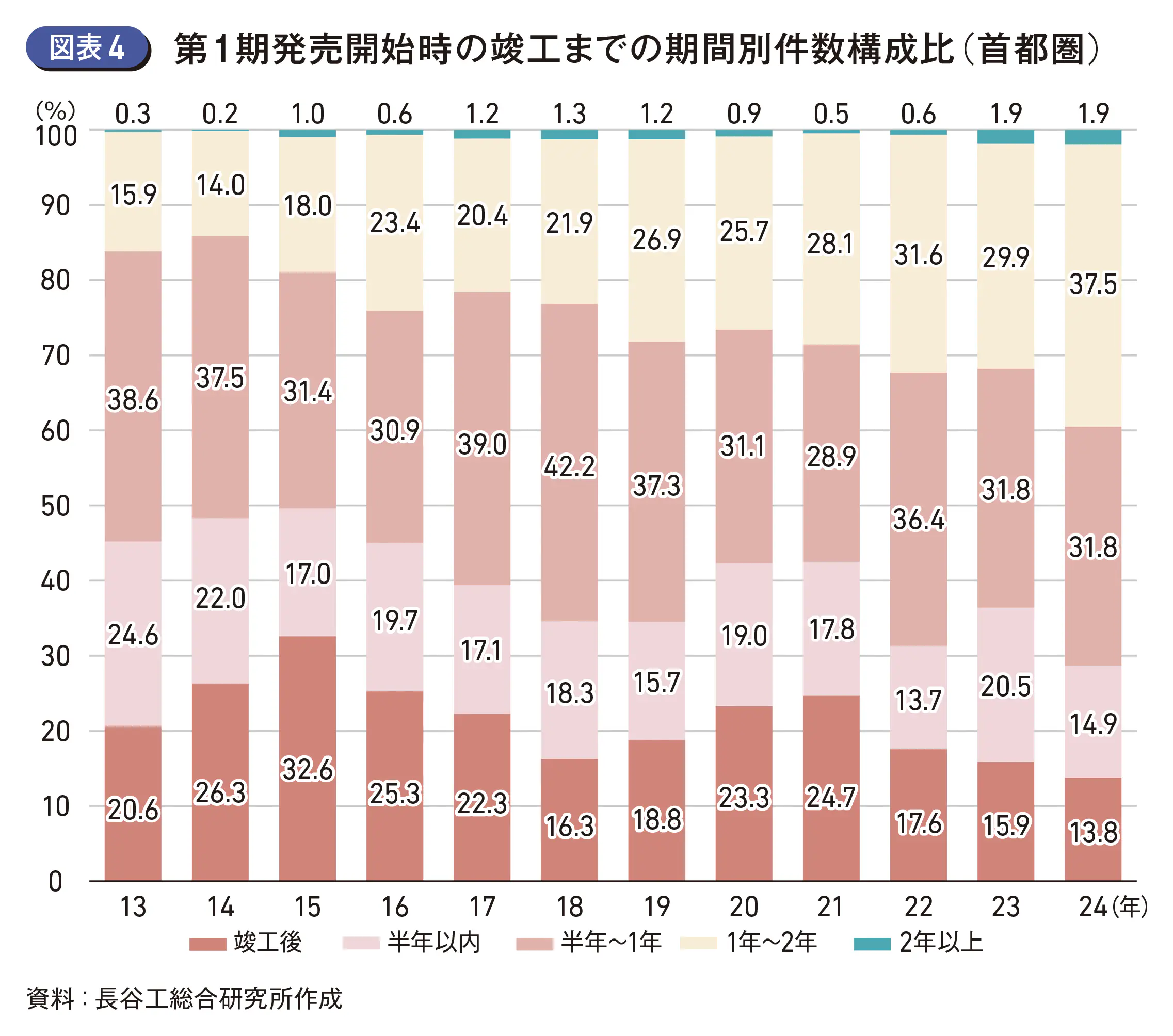 第1期発売開始物件数が前年を下回った背景として、大規模物件で着工から発売開始までの期間が長期化していることに加え、同時に全体をみると2024年は工期の長い超高層物件の供給戸数構成比が相対的に高かったこともあり、第1期発売開始時点で竣工まで1年以上の期間がある物件の割合が39.5%に拡大している(図表4)。発売開始から竣工まで長い販売期間があることで販売ペースは緩やかに推移し、第1期発売開始時をはじめ、続く供給においても戸数が絞り込まれている。また、価格の上昇傾向も相まって慎重な販売姿勢を強めた一因と考える。