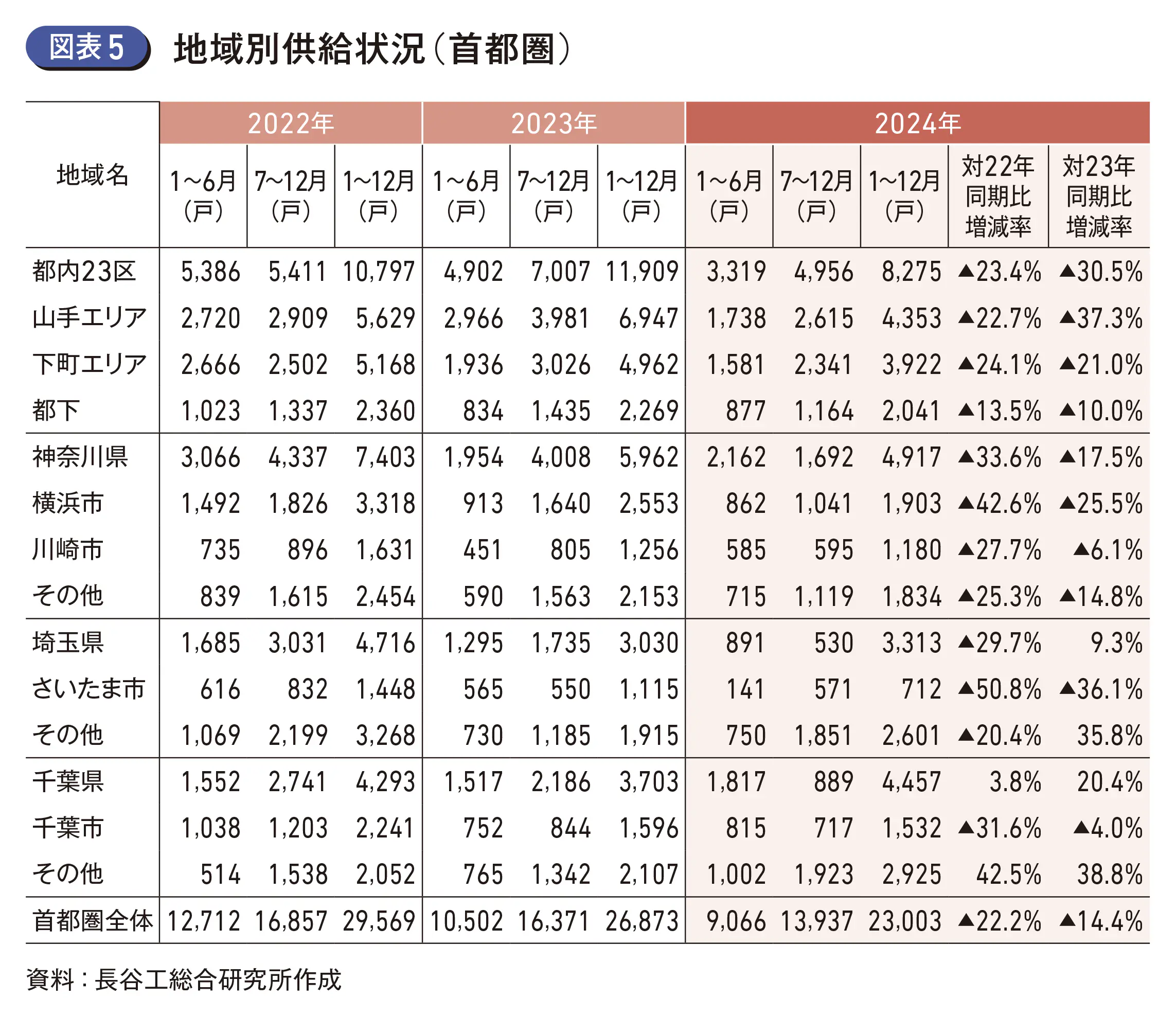 地域別供給状況を前年と比較すると、その他埼玉、その他千葉といった郊外部のみ前年を上回った(図表5)。都内23区山手エリアは、前年(6,947戸)から37.3%減の4,353戸にとどまった。前年に首都圏全体の供給戸数押上げに寄与した大規模物件の供給が一段落したことにより、港区(前年1,462戸→277戸)における減少が影響した。下町エリアでは北区(前年852戸→185戸)、足立区(同1,043戸→555戸)ほかで前年を下回り低調だった。