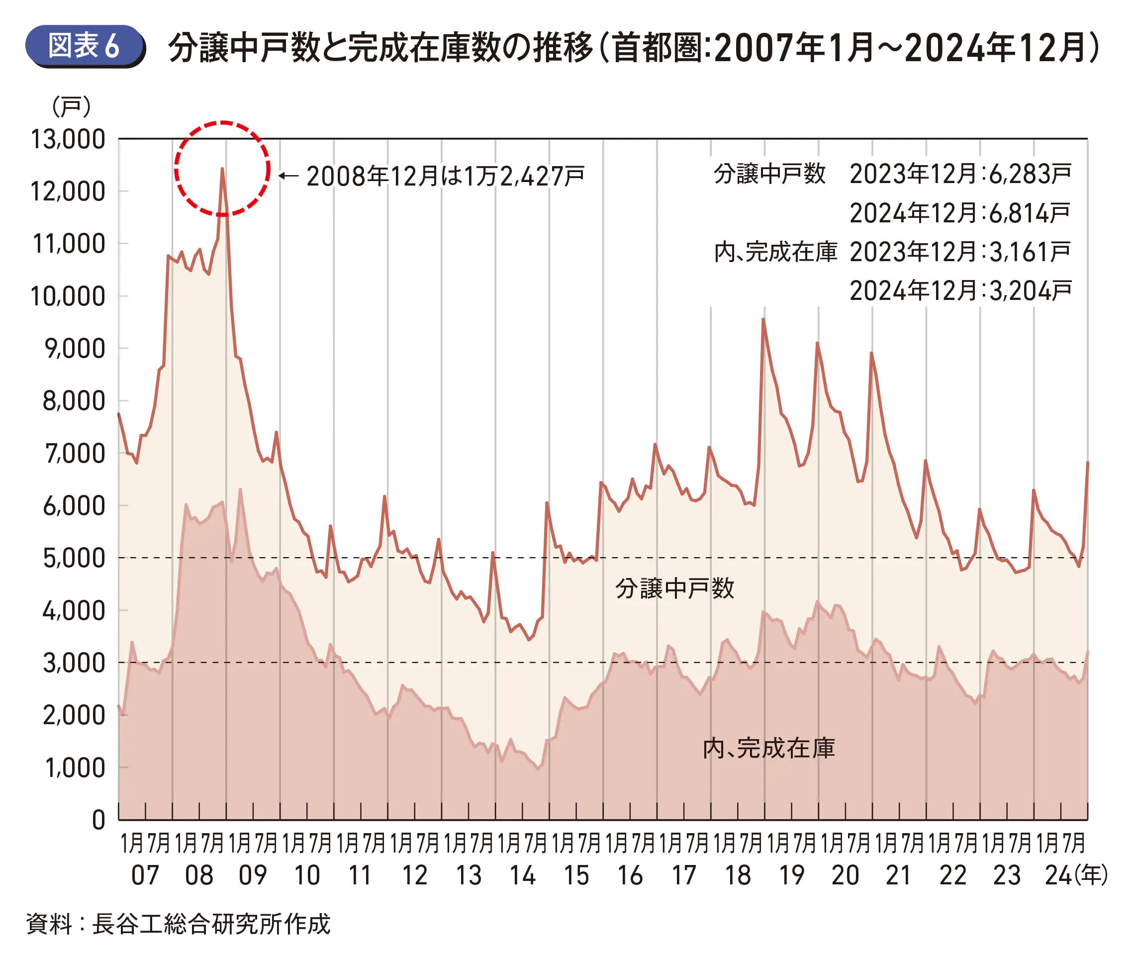 2024年12月末の分譲中戸数は6,814戸で2023年12月(6,283戸)より531戸増加、完成在庫は3,204戸で2023年12月末(3,161戸)より43戸増加した。価格が上昇している中、供給戸数の小分け化が進み、供給と同様に販売においても時間をかけて進捗していく傾向が強まったこともあり、2年連続で前年を上回った。また完成在庫は分譲中戸数より積み上がりが緩やかであるが、竣工まで期間のある物件の比率が増えたことも一因となっている(図表6)。