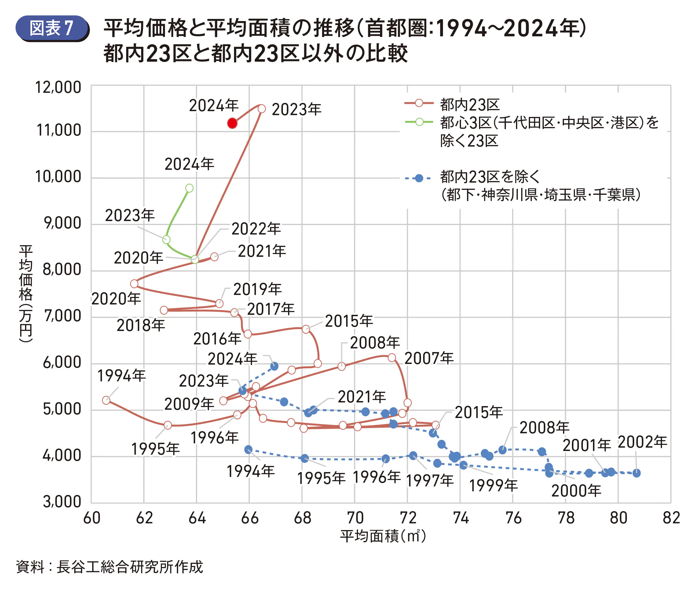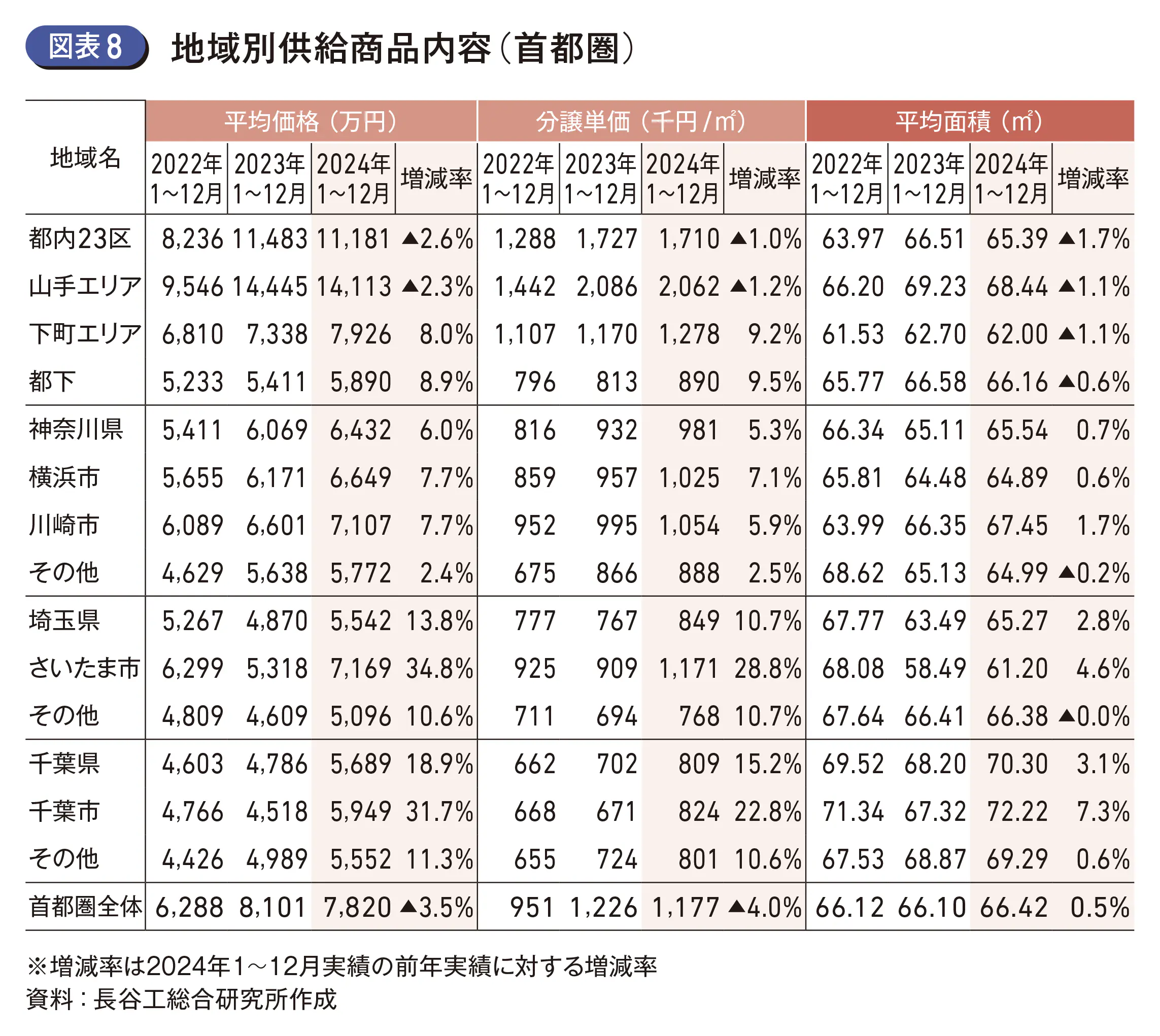 地域別に商品内容をみると、都内23区の分譲単価は前年比1.0%ダウンして1,710千円/㎡、平均面積は65.39㎡で同1.7%縮小し、平均価格は同2.6%ダウンの1億1,181万円。2年連続で1億1,000万円台となった。2023年は都心3区(港区・千代田区・中央区)の供給物件が分譲単価や平均価格を牽引したが、2024年はこれら3区を除いた平均価格も前年比13.0%アップの9,786万円で、1億円を窺う水準まで上昇している。