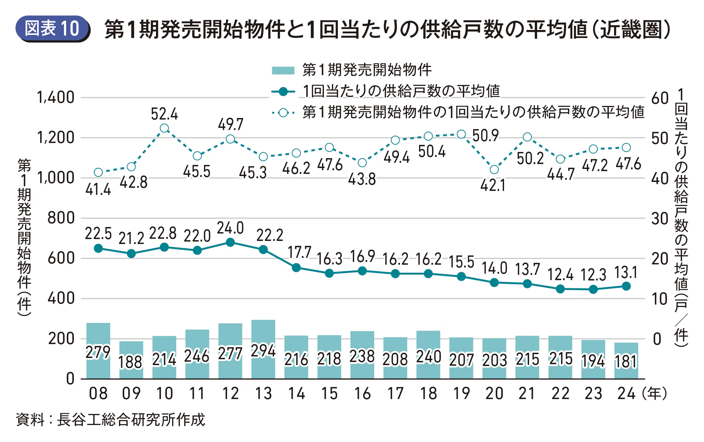 新規供給戸数は1,156件1万5,137戸で前年比1.6%減となり2023年に続き1万5,000戸台となった。年初予測、中間見直し共に1万7,000戸程度とし、上半期では前年同期比5.5%増の6,410戸が供給されたが、下半期は8,727戸にとどまり予測を下回った(図表9)。供給件数は1,156件、供給プロジェクト数は341物件で前年(供給件数1,249件、供給プロジェクト数366物件)から更に絞り込まれた。1回当たりの供給戸数が10戸未満にとどまる小分け供給物件の構成比は72.0%と前年(74.4%)に引き続き高く、1回当たりの供給戸数の平均値も13.1戸/件と前年を上回ったものの限定的だった。第1期発売開始物件は181件8,618戸で前年(194件9,158戸)を下回り、第1期発売開始物件の1回当たりの供給戸数の平均値は47.6戸/件で前年(47.2戸/件)と同水準だった(図表10)。
