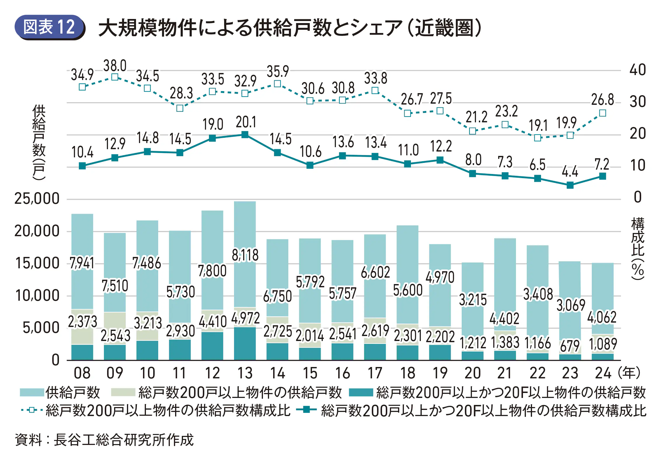 総戸数200戸以上の大規模物件は4,062戸と前年(3,069戸)から1,000戸程度増加し、新規供給戸数に全体に占める構成比は26.8%で前年(19.9%)を上回った。また総戸数200戸以上かつ20階以上の超高層物件による供給戸数も1,089戸と前年(679戸)から大幅に増加、新規供給戸数全体に占める構成比は7.2%と前年(4.4%)を上回った(図表12)。