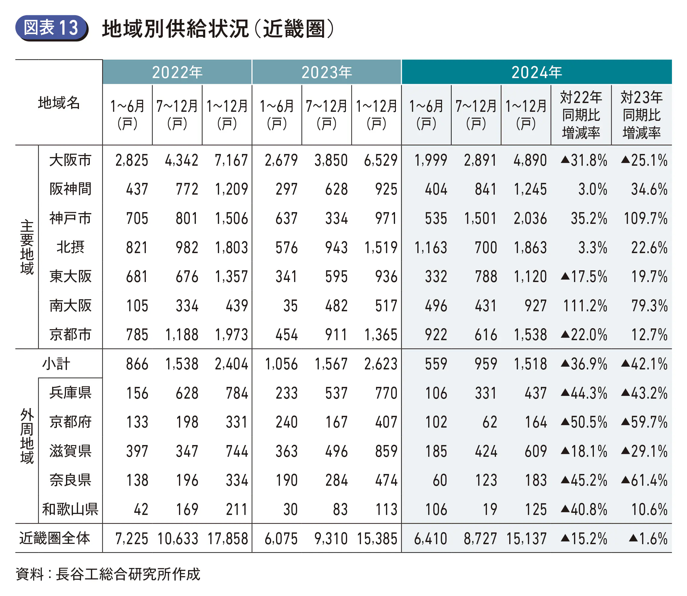 地域別の供給状況をみると主要地域では大阪市を除き前年を上回った。外周地域は和歌山県を除き前年を下回った(図表13)。大阪市ではワンルームマンションが1,336戸と前年(2,613戸)から大幅に減少したことも低調な供給の一因となった。一方でワンルームマンションの外周化が進み、神戸市で939戸(前年234戸)、東大阪で178戸(同0戸)、京都市で365戸(同49戸)と供給戸数の押し上げに寄与した。