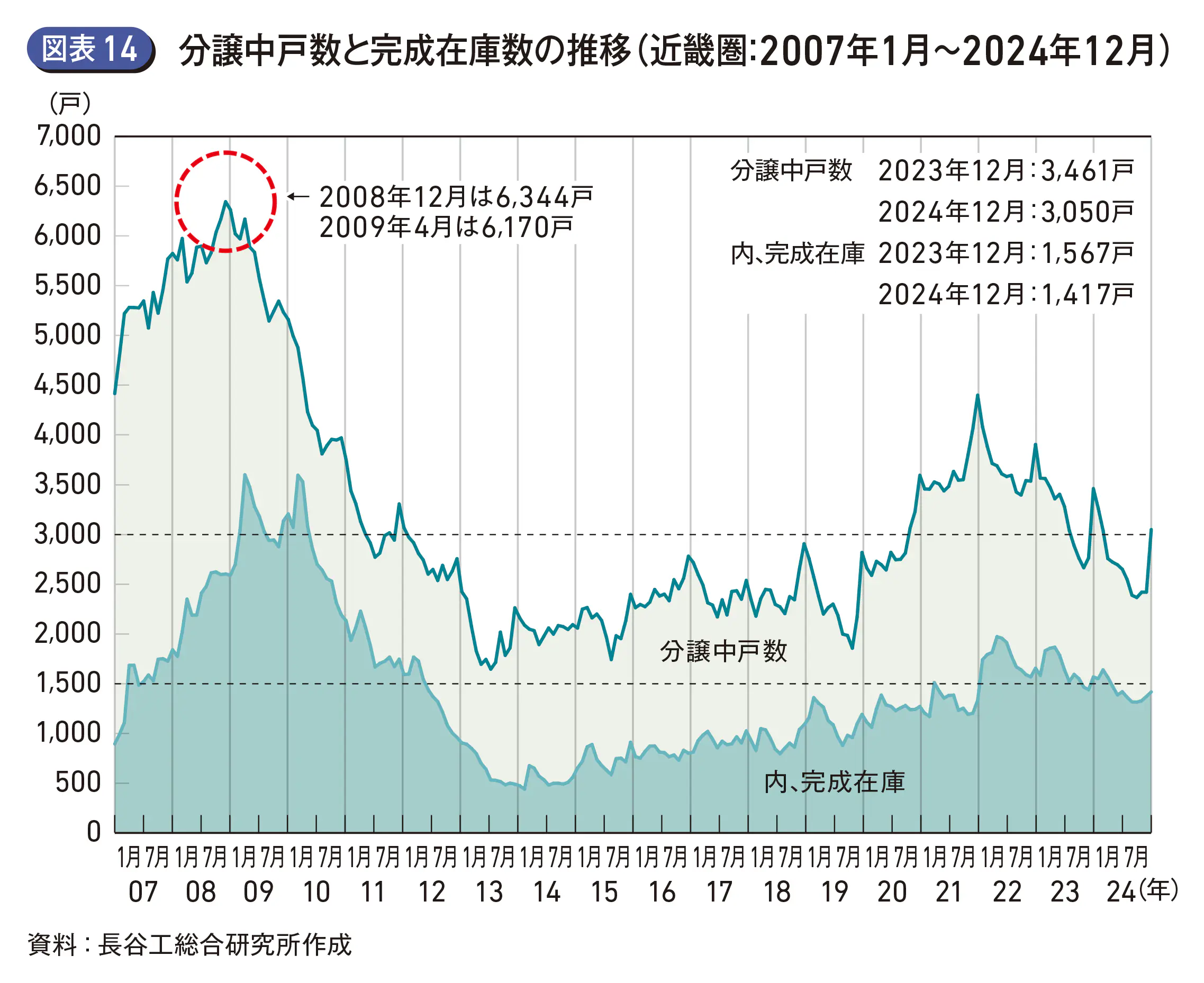 2024年12月末の分譲中戸数は3,050戸で2023年12月末から411戸減少、3年連続で前年を下回った。完成在庫は1,417戸で2023年12月末から150戸減少。年末の完成在庫が1,500戸を下回ったのは2021年12月末以来で在庫販売は堅調に推移している(図表14)。