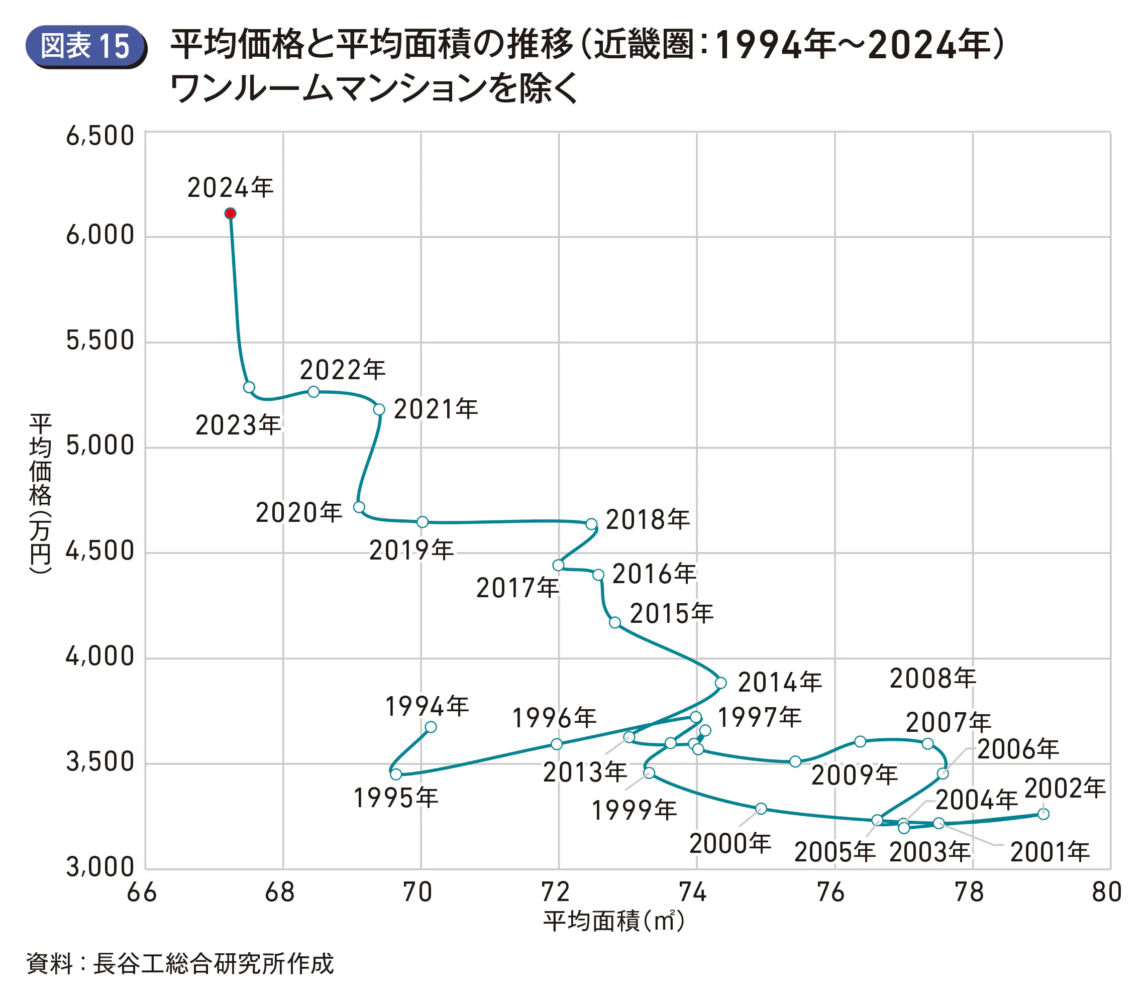 近畿圏全体の分譲単価は前年から14.7%アップの907千円/㎡で前年に続き最高値を更新。平均面積は59.10㎡で前年(59.04㎡)と同等で、平均価格は前年から14.8%アップの5,357万円。1991年以来の5,000万円台となった。