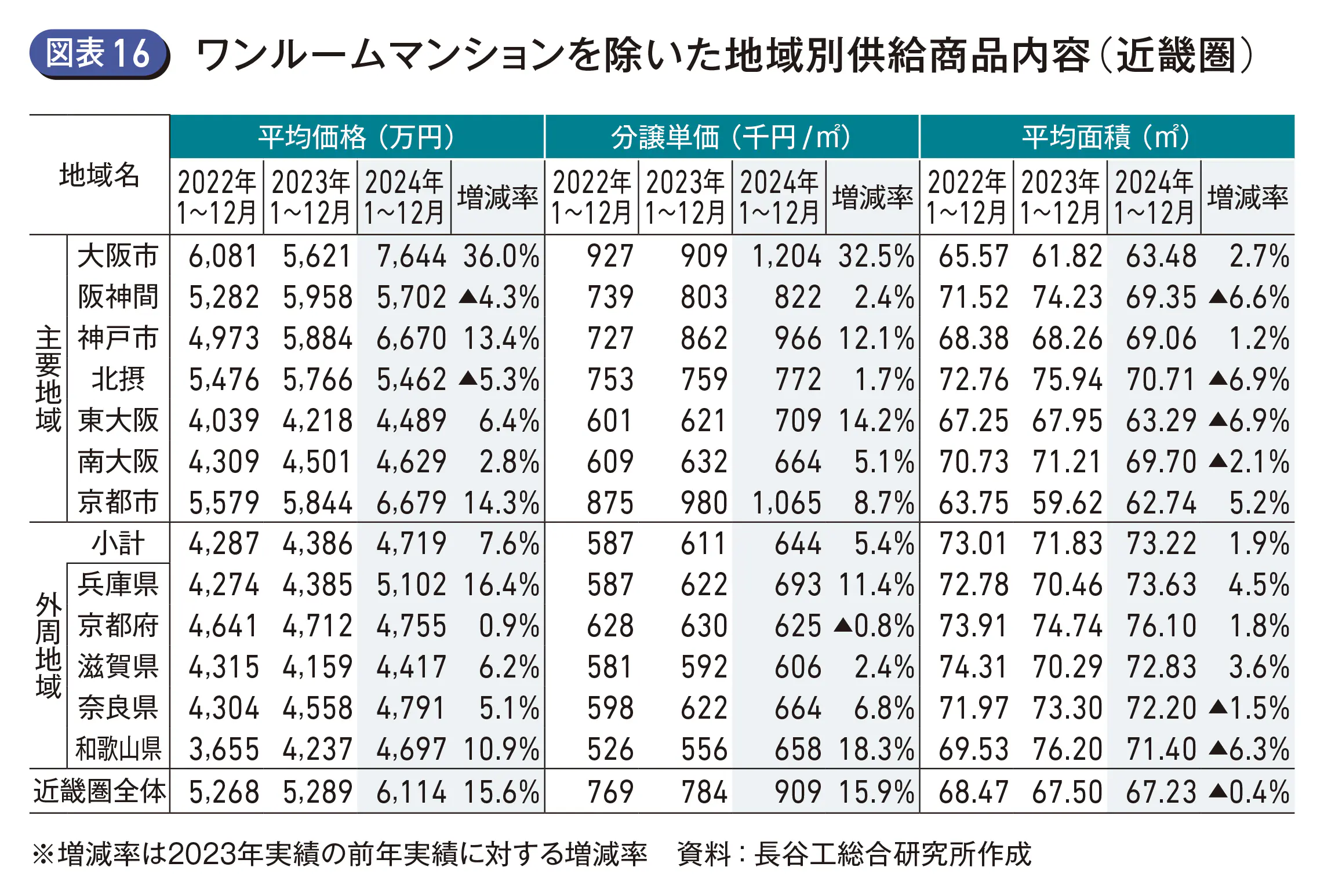 ワンルームマンションを除いた分譲単価は前年より15.9%アップの909千円/㎡。平均面積は67.23㎡で前年(67.50㎡)と同程度、平均価格は前年より15.6%アップし、6,114万円となった。地域別では大阪市で都心部における大規模超高層物件が供給された影響もあり、分譲単価は前年より32.5%アップし1,204千円/㎡。平均面積は前年より2.7%拡大し63.48㎡。平均価格は前年より36.0%アップの7,644万円となった。平均価格は高額物件が供給されたこともあり、神戸市で6,670万円(前年比13.4%アップ)、京都市で6,679万円(同14.3%アップ)と6,000万円台に達した一方で、阪神間は平均面積が69.35㎡で前年より6.6%縮小し5,702万円で前年比4.3%ダウン、北摂でも平均面積は70.71㎡で前年より6.9%縮小し平均価格は5,462万円で前年より5.3%ダウンするなど、面積が圧縮され価格の上昇を抑制する動きも見られた。外周地域ではその他兵庫県で再開発による大規模超高層物件の供給もあり、平均価格は前年より16.4%アップして5,102万円となった。その他兵庫県以外の地域でも価格は上昇し前年を上回っているが4,000万円台で推移している(図表15・16)。