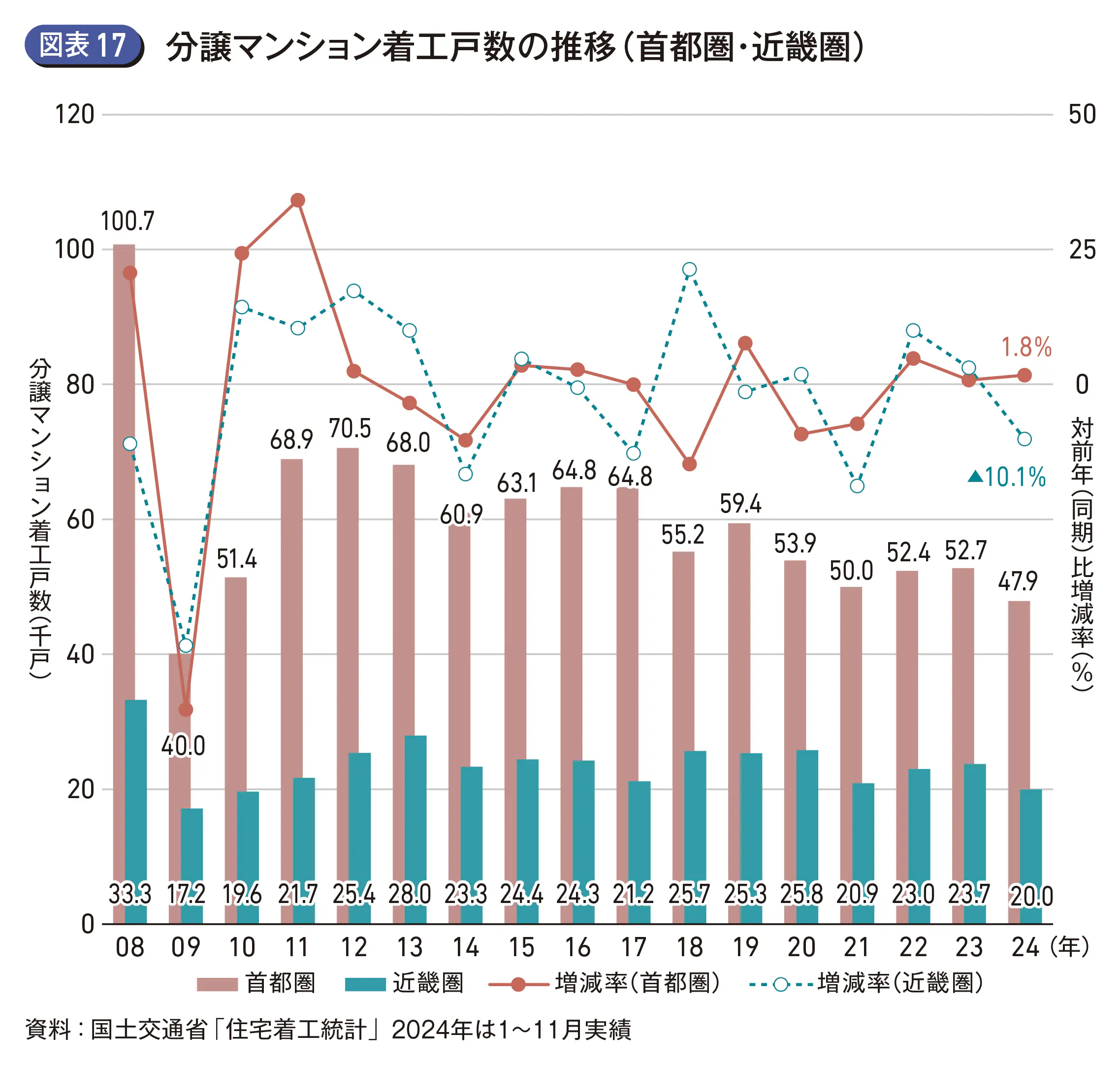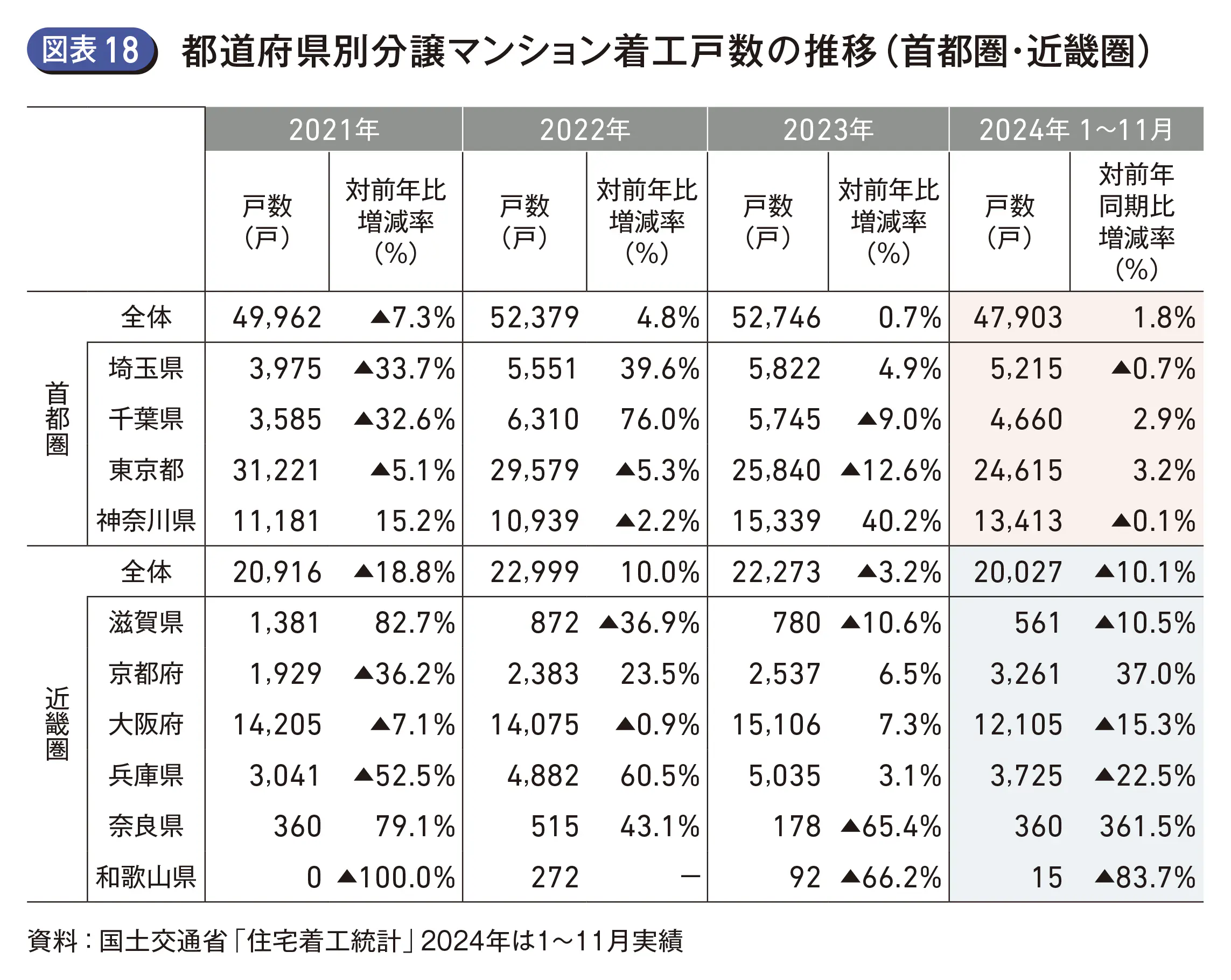 2024年1〜11月の分譲マンション着工戸数は首都圏では4万7,903戸で前年同期を1.8%上回ったが近畿圏は同10.1%下回る2万27戸。年間では首都圏は5万戸台前半、近畿圏は2万戸台前半となると見込まれる。