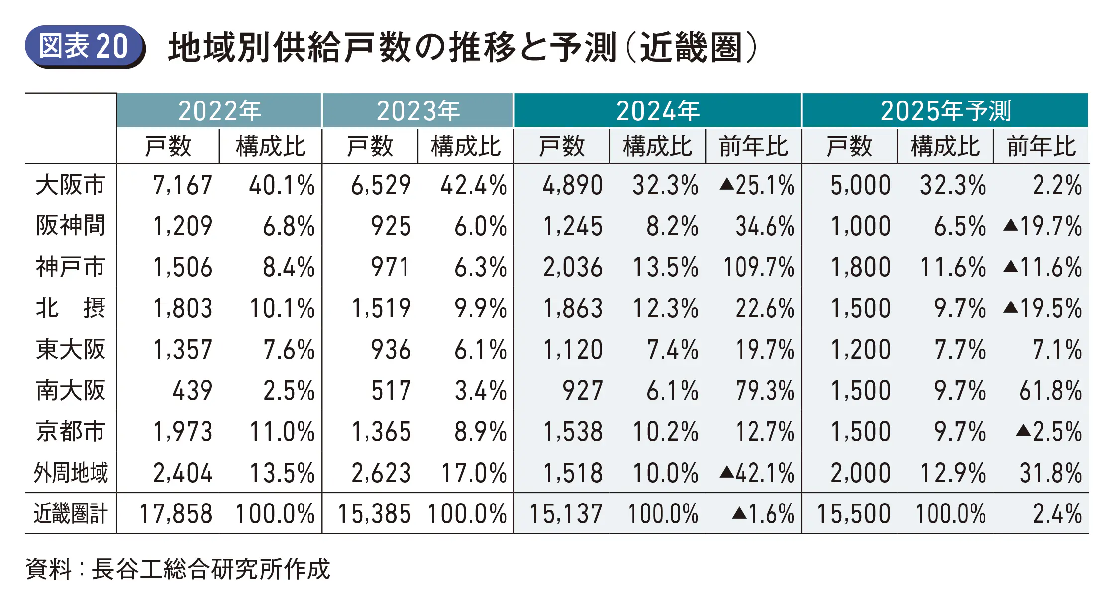 近畿圏では前年同様販売は堅調であるものの、販売戸数を小分けにした慎重な供給が続き、2024年11月末時点では着工戸数も減少していることから供給戸数は、前年(1万5,137戸)や2023年(1万5,385戸)と同程度の1万5,500戸程度とした(図表20)。