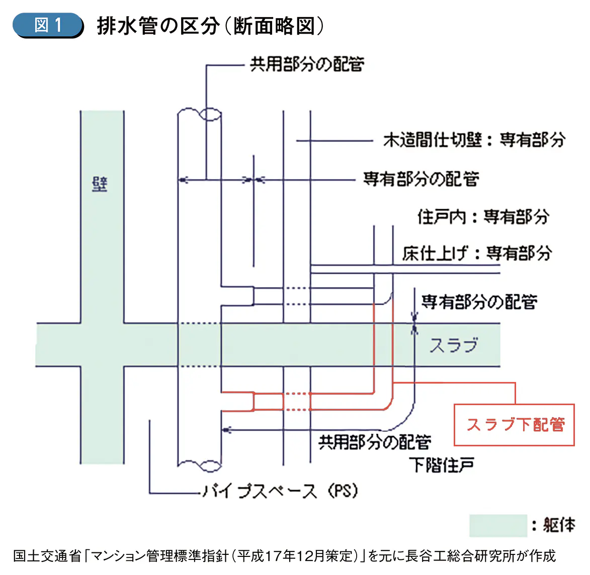 まず、改修費用や合意形成が挙げられるが、マンションには❺「一つの建物が共用部分と専有部分に区分されている」特徴がある。マンションは区分所有者で共有するため、建物を共有する部分と個人で専有する部分に区分されている。しかし、「共用部分と専有部分がひと続きになっている」工種等では、改修に当たって共用部分・専有部分両者の摺り合わせが必要となる。具体的には給排水管が挙げられる。図1は排水管の共用部分・専有部分の区分の概念図であるが、専有部分の枝管(横引き管)だけを改修しても排水竪管部分が古いままだと漏水などの問題が起こることがある。逆に、共用部分である排水竪管を更新する際には専有部分との調整が必要となる。管が貫通している壁や床も解体が必要であるし、区分所有者がこの機会に台所等のリフォームを図ろうという意向もあろう。さらに、マンションの築年が古い場合には排水竪管から伸びる枝管が下階のスラブから繋がっている、いわゆる「スラブ下配管」(下図赤線)であることもある。この場合は、排水竪管更新時に「スラブ下配管」を解消するよう分岐をスラブ上に設置することが望ましいが、これも管理組合と区分所有者との個別調整が必要である。